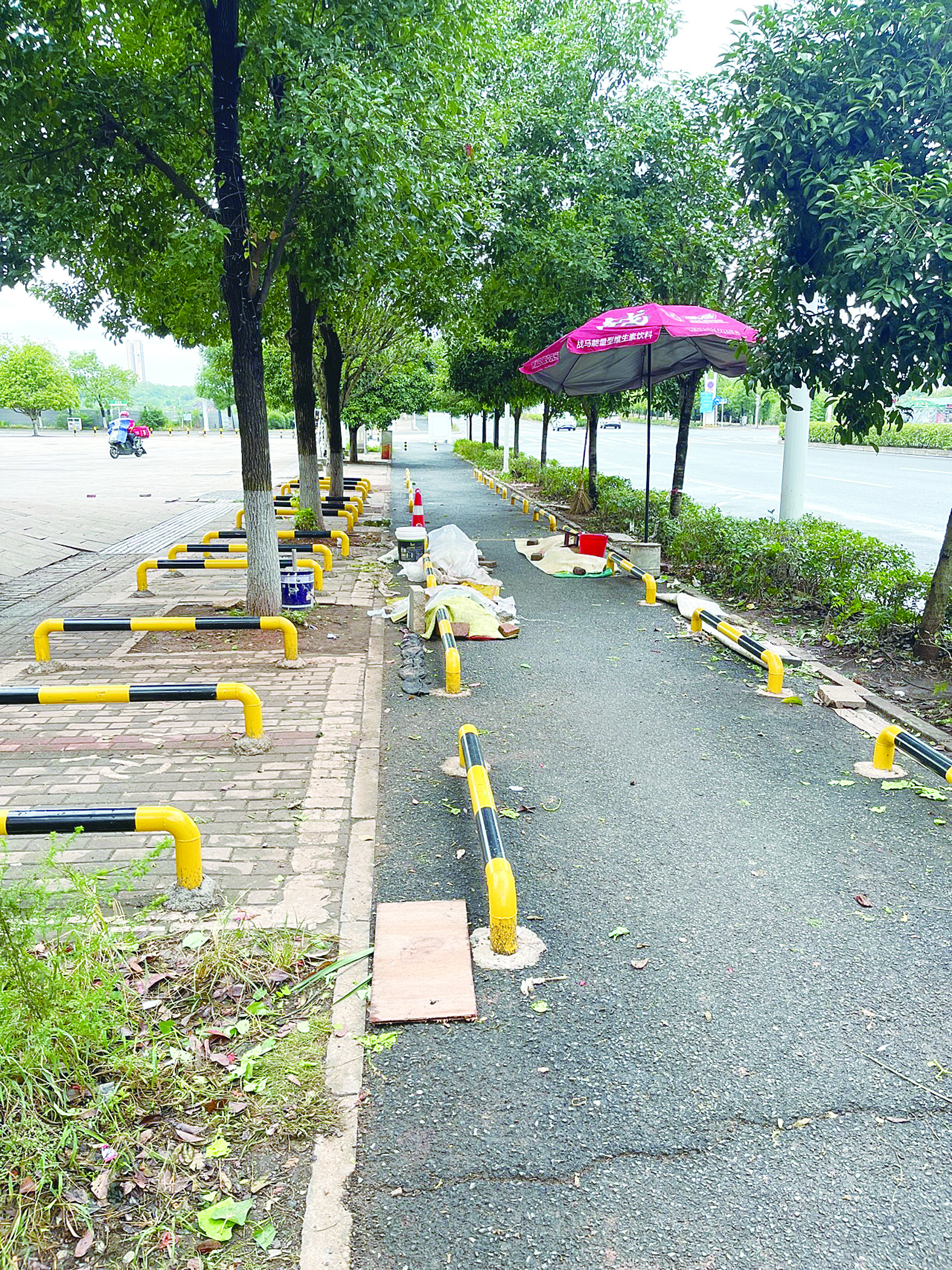 人行道、非机动车道被安装隔离杆。 记者/刘平 摄