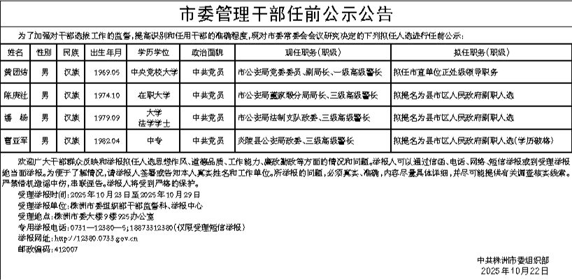 市委管理干部任前公示公告