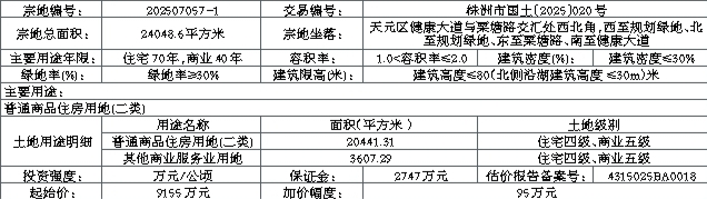 202507057-1:一、由竞得人自《国有建设用地使用权出让合同》签订之日起30日内缴至不低于成交总价款的50%,360日内全额缴清;二、按照《市本级出让国有建设用地交付工作规则》(株资规办发〔2021〕43号)实施交地;三、宗地成交之日起30日内应在自然资源部土地动态监管系统中录入《国有建设用地使用权出让合同》;四、竞得人不按土地出让合同约定及时缴纳土地出让价款的,报经市人民政府批准,出让人有权根据《国有建设用地使用权出让合同》第二十九条的约定,扣除定金(按宗地出让价款的20%确定)后直接解除土地出让合同,收回土地使用权;五、供应对象为中华人民共和国境内外的具有房地产开发资质公司、企业、其他组织(不含个人);六、报名时应提交符合自有资金购地要求的证明材料。