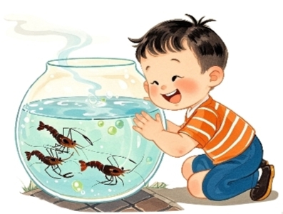 今天,我和外婆去菜市场买了些河虾,个个鲜活饱满!我特意挑了三只最活泼的,放进小玻璃缸里养着,满心欢喜地观察它们。