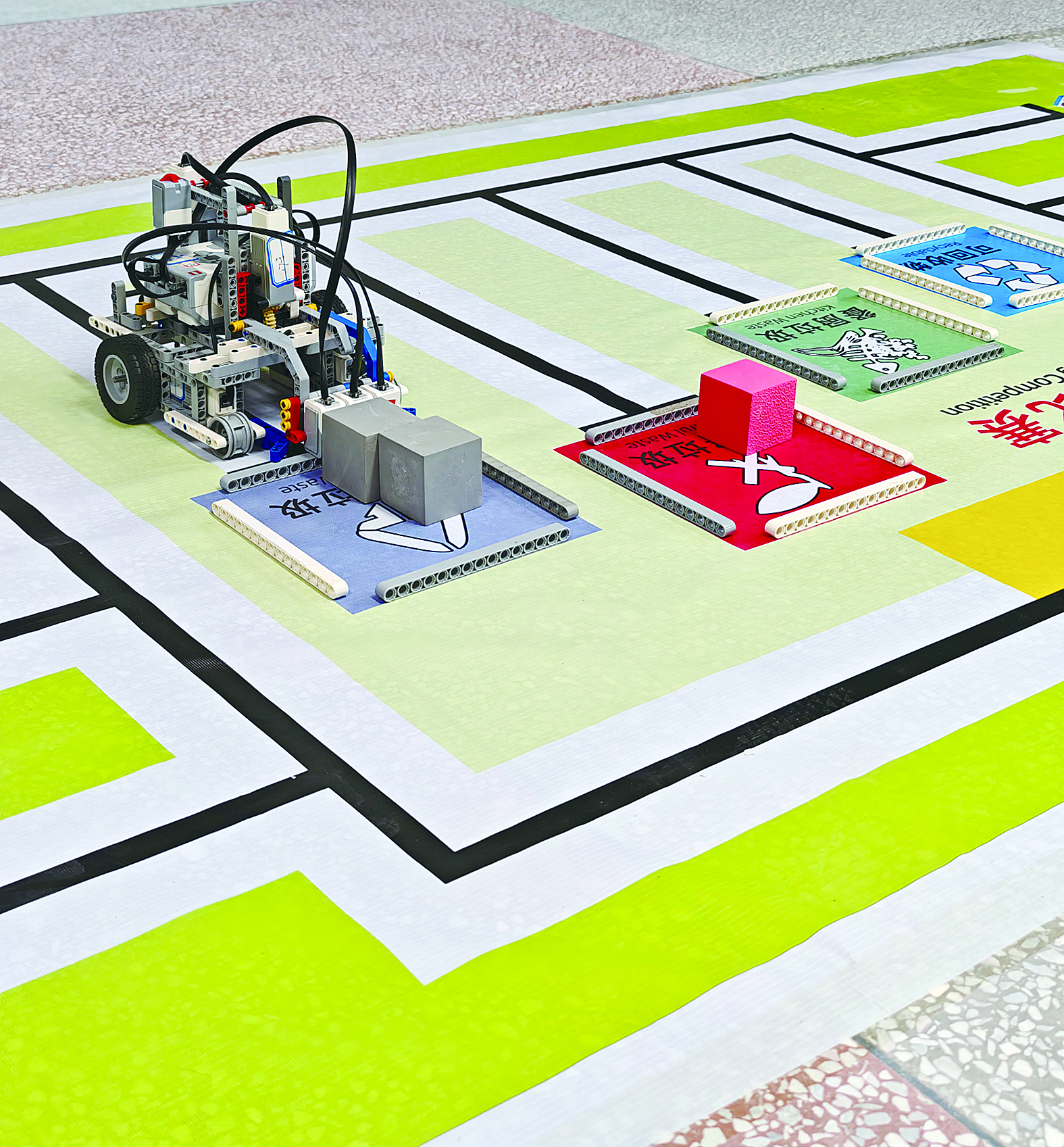 在智能搬运竞赛现场,参赛选手们就要通过编程,为机器车装上“聪明大脑”,让它们变成智慧垃圾分类车——不仅要准确捡拾、搬运不同类型的“垃圾”,还要把它们分类送到指定位置。