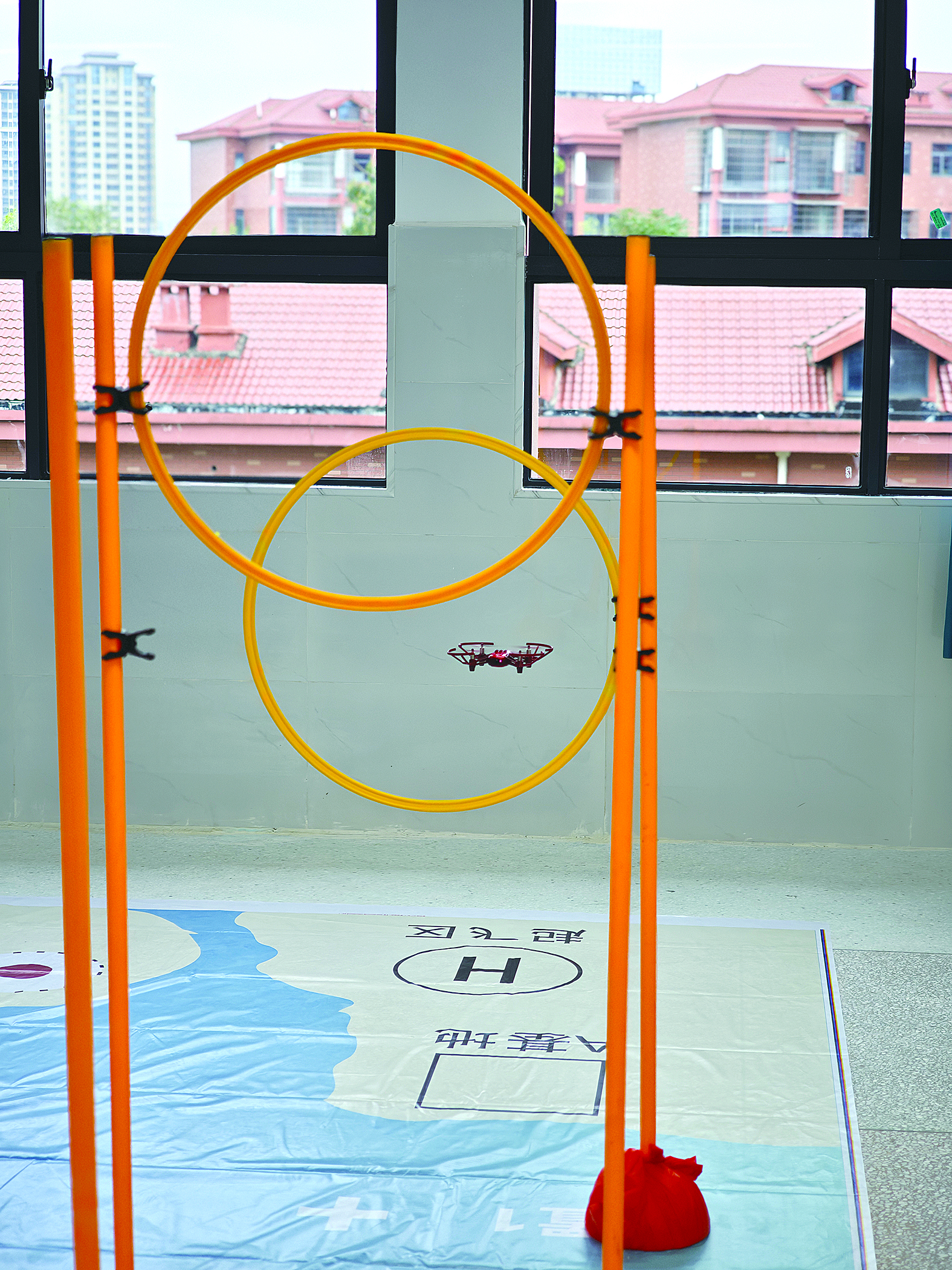 起飞后,无人机要穿越高低错落的圆环,还要连续绕杆,最后在指定位置降落。