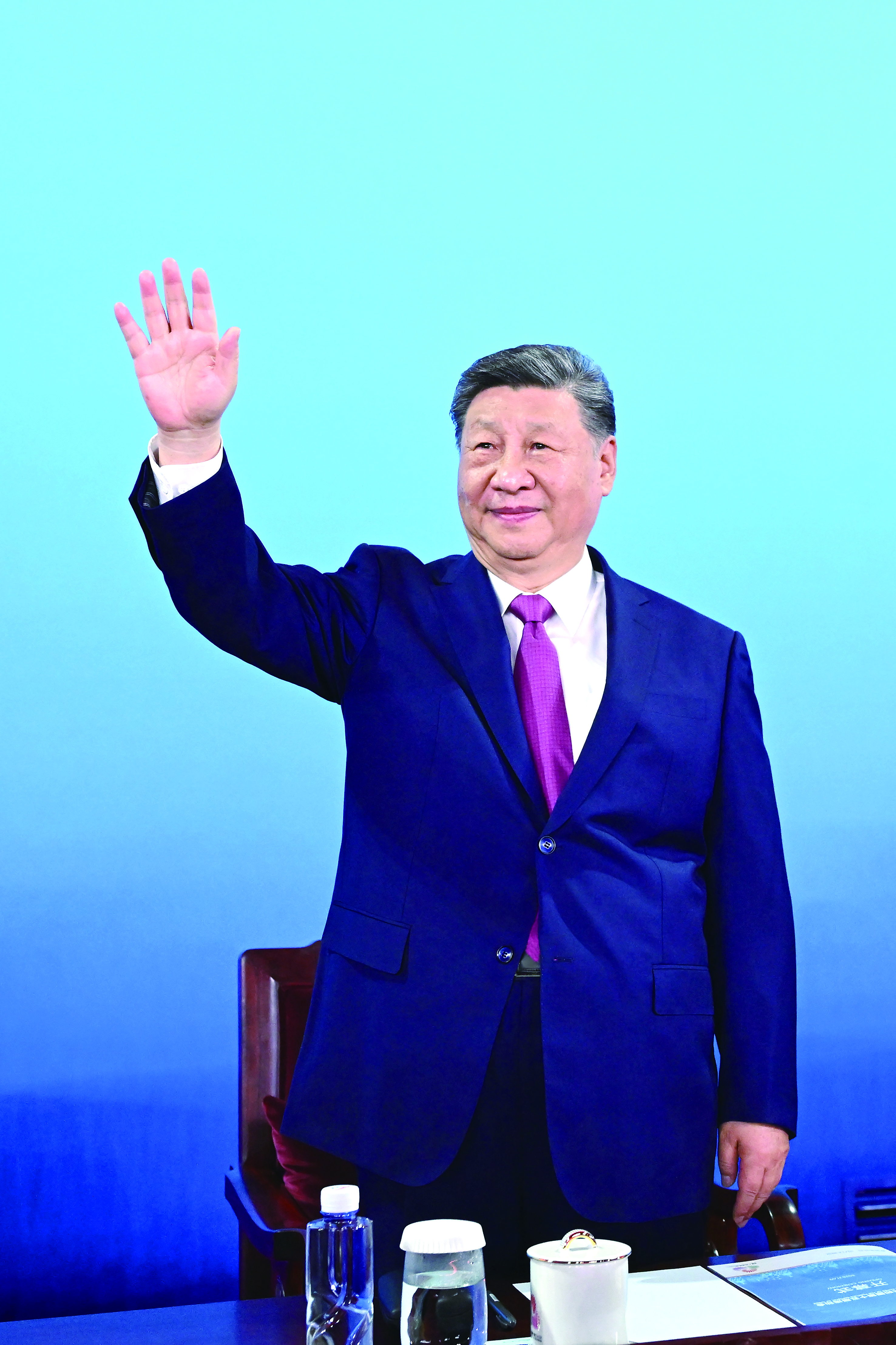 左图:11月9日晚,中共中央总书记、国家主席、中央军委主席习近平在广东省广州市出席中华人民共和国第十五届运动会开幕式并宣布运动会开幕。这是习近平在主席台上向大家挥手致意。 新华社记者 燕雁 摄