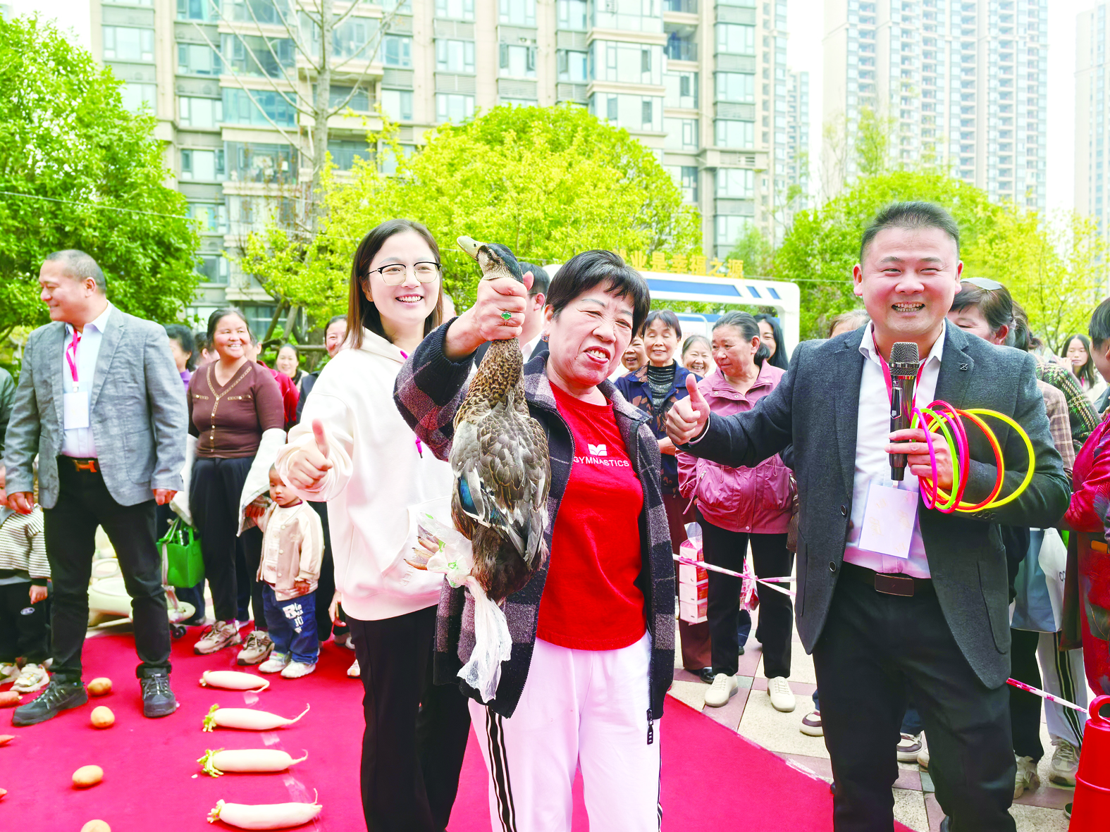 10月29日,天元区马家河街道农科社区举行幸福邻里节暨重阳敬老主题活动,居民踊跃参与套圈等游戏,套到活鸭、蔬菜等,开心不已。