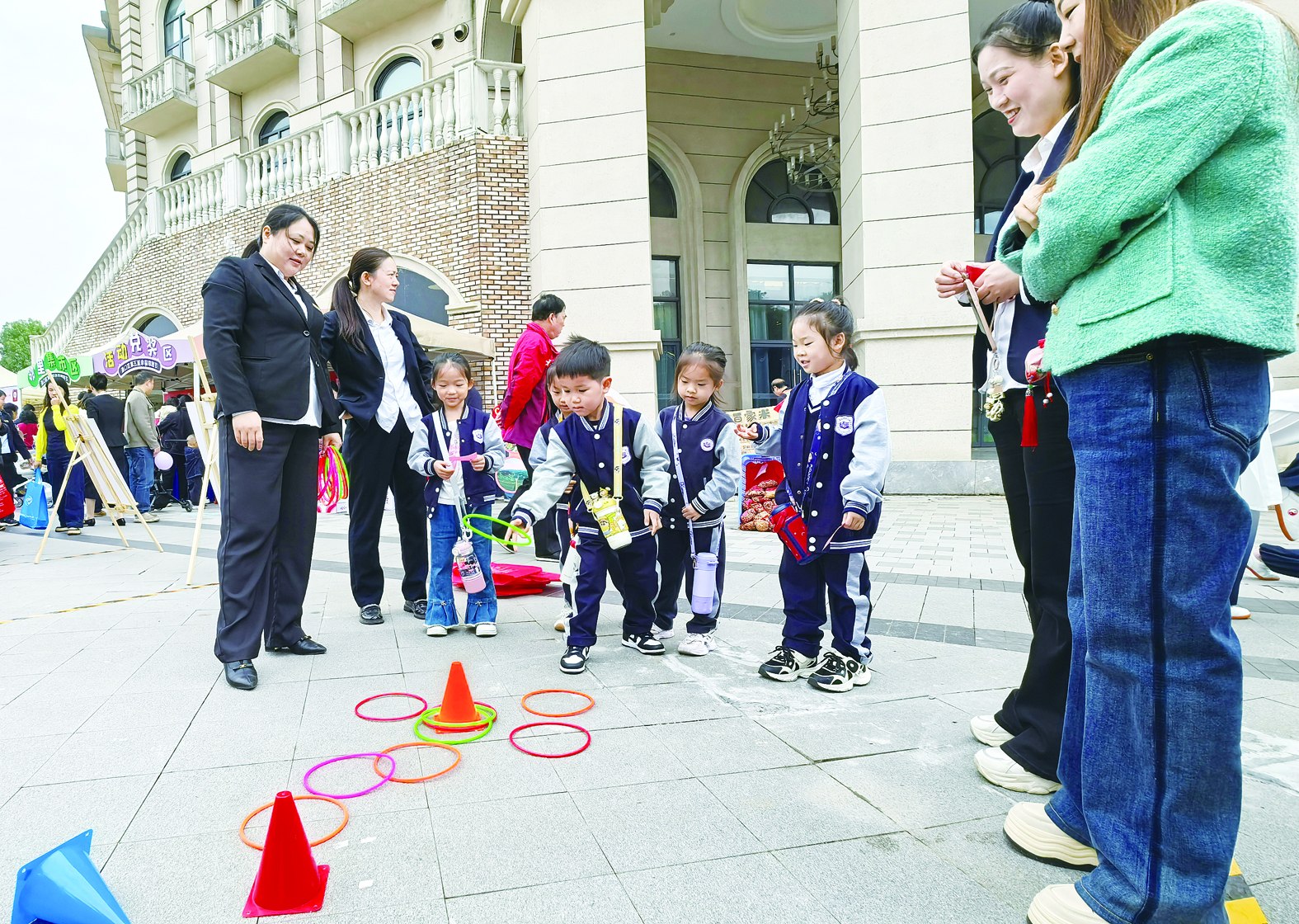 在活动主会场象石社区青龙湾营销会馆前坪,人气最高的当属邻里集市,株洲王十万黄辣椒、南洲忆山茶油、岳峰药糖等本土特色农产品琳琅满目、价格亲民,渌口自有品牌咖啡“LOOK UP”、现炸酥脆大油条、软糯可口的酸枣糕香气四溢,吸引了众多居民品尝购买。一旁的游戏互动区人气也很旺,套圈、背对背挤气球、夹黄豆等经典游戏,无论是亲子协作还是邻里对决,都乐趣十足,现场不时传来阵阵笑声和欢呼声。