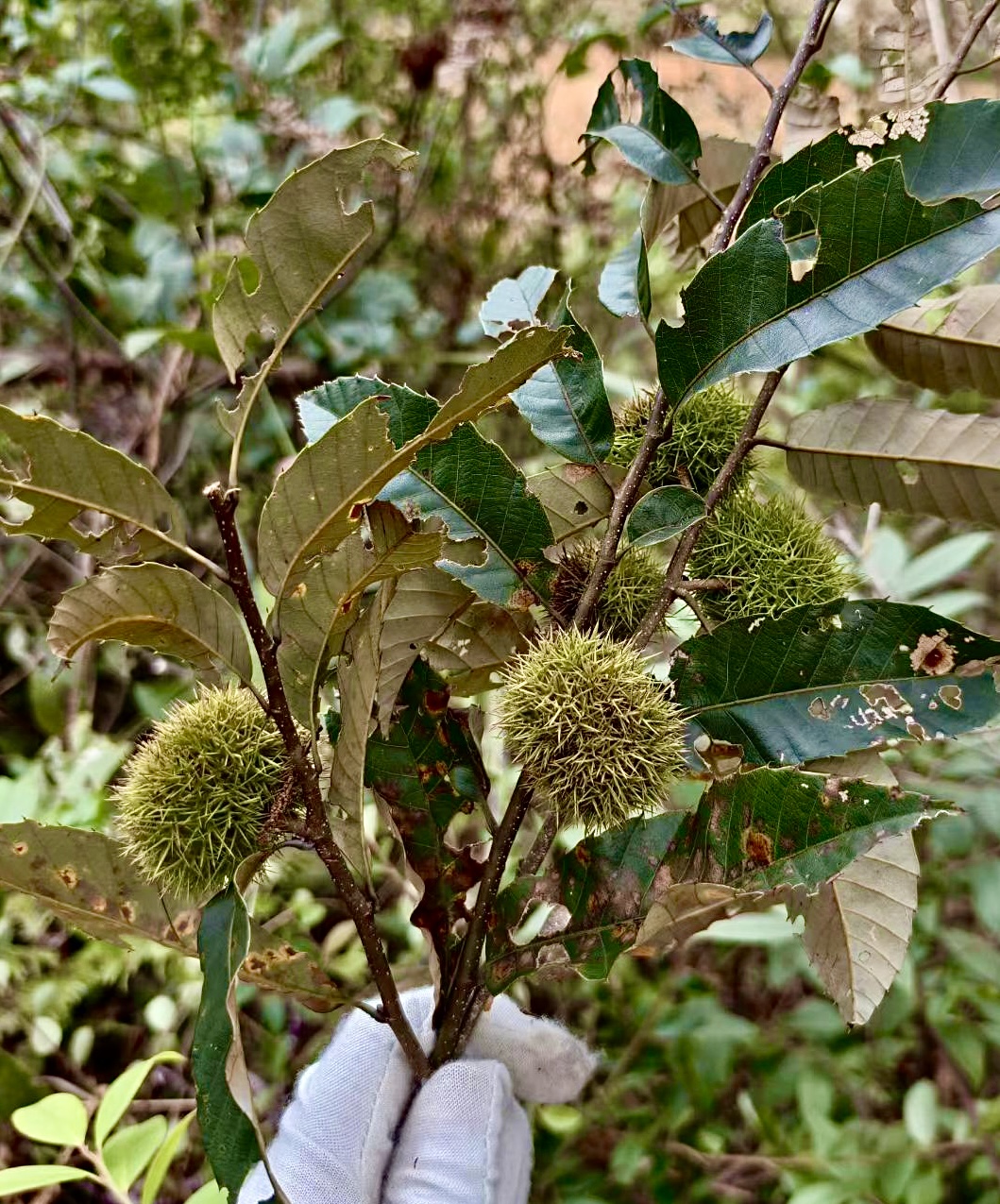 毛栗有刺,比自家种的板栗小些,采摘时得靠夹子。夹子是用直径约50mm的竹子,中间剖开,局部加热弯成U形,弯后长约200mm,有弹力,开口当夹子,是采摘带刺毛栗球的必备工具。在我家的附近山上,有零星的毛栗树分布,常跟其他灌木一样被砍去当柴烧,产果不多。而树多果多的地方,是在离家十多公里的海拔800米左右的山上,与安仁县交界。这里多是以毛栗树数量多的夹草灌木带,山顶有条宽阔防火带。