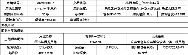 202206042-1:一、由竞得人自《国有建设用地使用权出让合同》签订之日起30日内缴至不低于土地成交总价款的50%,360日内全额缴清;二、按照《市本级出让国有建设用地交付工作规则》(株资规办发〔2021〕43号)实施交地;三、宗地成交之日起30日内应在自然资源部土地动态监管系统中录入《国有建设用地使用权出让合同》;四、竞得人不按土地出让合同约定及时缴纳土地出让价款的,报经市人民政府批准,出让人有权根据《国有建设用地使用权出让合同》第二十九条的约定,扣除定金(按宗地出让价款的20%确定)后直接解除土地出让合同,收回土地使用权;五、竞得人需维持地块现状,不得进行建设活动;六、出让起始价44913万元,其中土地出让起始价确定为4325万元(合165.12万元/亩,楼面地价3135.21元/㎡);其中地面建(构)筑物价格40588万元。