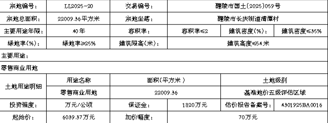 LL2025-20:(一)竞得者应在成交确认书签订之日起10个工作日内签订出让合同。(二)土地成交价款由竞得者在出让合同签订之日起一个月内缴纳出让金的50%,半年内缴清余款,逾期未缴部分,根据相关规定,征收违约金。(三)由醴陵市土地储备中心按现状条件交地,并承担因交地产生的相关法律责任。(四)须按醴陵市自然资源局出具的《2020年第五批次建设用地B地块用地性质认定蓝线图及规划条件》实施。(五)该地块采取带抵押供应,抵押权人同意带抵押供应。