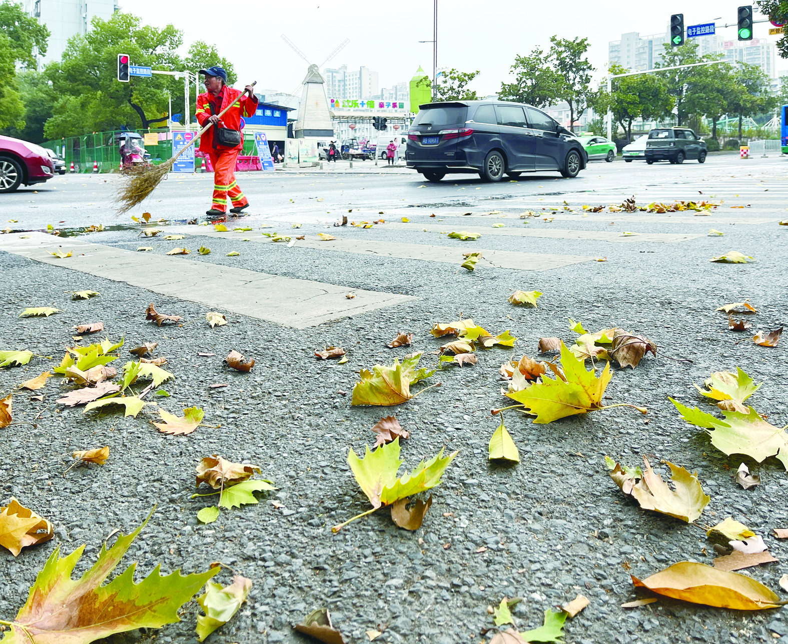 11月17日,受寒潮天气影响,大风导致株洲城区落叶明显增多。街头,环卫工人坚守岗位,做好落叶清扫、收集、处置等工作,为市民营造了干净整洁的城市环境。此次寒潮天气从16日晚开始,将持续到18日,降温明显。图为环卫工人在街头清扫落叶。