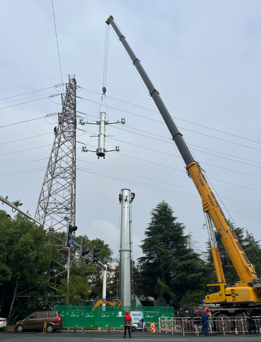 施工现场,施工人员在一座24米高的高压线路铁塔旁,安装杆塔。这座杆塔的高度将达到35米,能进一步确保附近高压电线与行道树之间的安全距离。
