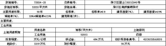 T2024-35:(一)须按照株洲市渌口区自然局2024年11月25日出具的《株洲市渌口区规划条件通知书》(编号202411008)及蓝线图实施。(二)该宗地以标准地供地,固定资产投入强度≥216万元/亩、地均收入≥320万元/亩、地均税收≥20万元/亩。(三)竞得人在成交后10个工作日内签订《国有建设用地使用权出让合同》,按现状交地。出让金自《国有建设用地使用权出让合同》签订之日起1个月内缴清50%,3个月内全部缴清。(四)相关用地矛盾由渌口高新区、竞得人共同协调处理。