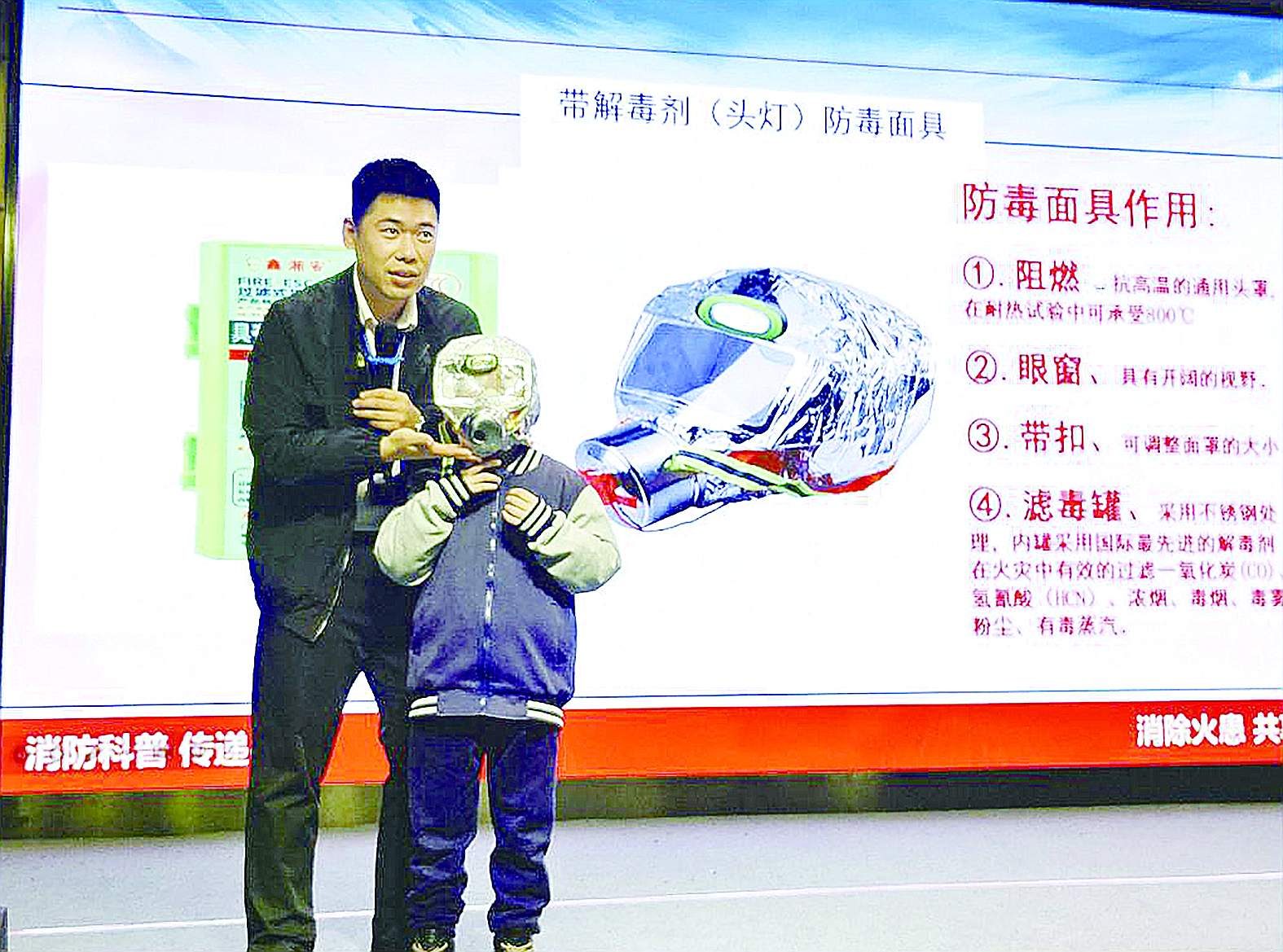 11月是全国消防安全宣传月,株洲市二中枫溪学校小学部西校区将消防安全教育阵地搬进多媒体厅,通过国旗下讲话、专业培训、消防逃生操表演等系列活动,用直播的方式将实用的消防知识、应急技能传递给全校3000多位师生,为校园安全筑起坚固屏障。图为学生试戴防毒面具。