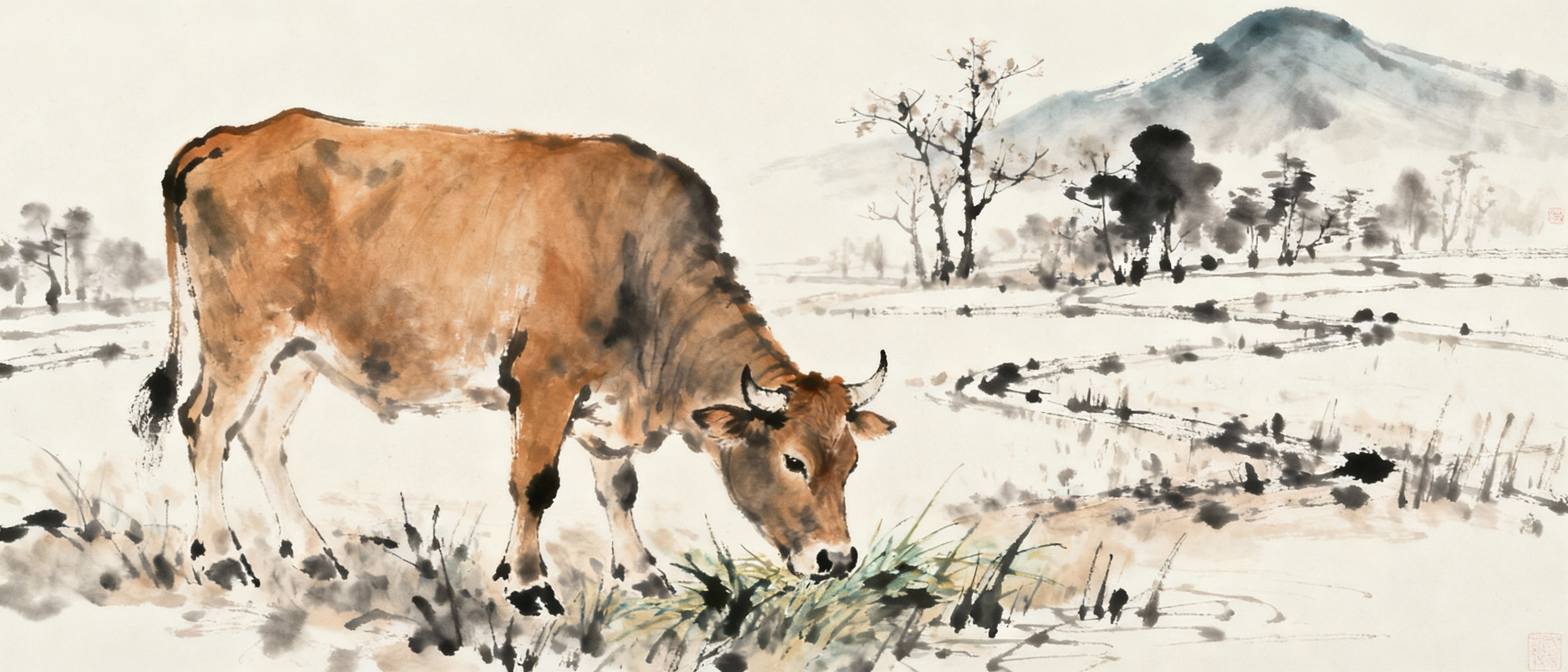 牛角是最具风骨的。老农民说:“牛低头吃草,昂首展角。”那一对弯角,不仅是防卫的利器,更是尊严的象征。当初我学画牛时,邻村老汉说:“牛斗力在角。你看它尾巴夹紧,全身力气都贯到角上。”他养的黄牛去年救了整个牛群——山洪冲垮围栏时,那头最温顺的母牛竟用牛角顶开木桩,让小牛先逃走。