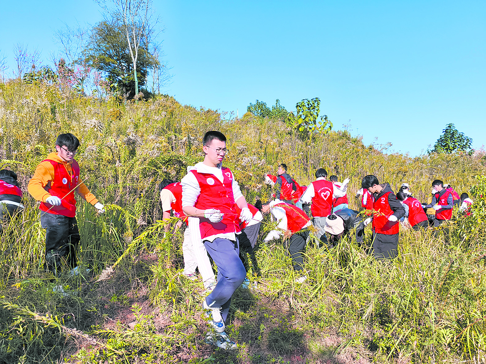 湖南工业大学的学子参与博古山公园“加拿大一枝黄花”清除行动。记者/杨如 摄