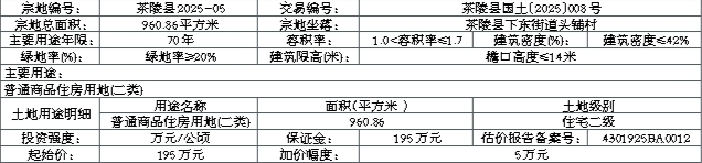 茶陵县2025-05:1.竞得人应在成交确认书签订并完成土地出让成交公示后,10个工作日内签订出让合同。2.竞买意向单位在竞买过程中应对本宗土地进行实地勘踏,并完全知晓土地现状情况,对按现状交地无异议。3.竞得人须严格按照2025年10月13日出具的《茶陵县2024年第四批次建设用地项目(地块二)宗地规划条件通知书》(茶规通〔2025〕2号)内容和茶陵县国土空间规划专题会议2025年第2次会议纪要相关精神实施。4.由茶陵县自然资源局土地储备中心按现状条件交地,并承担因交地产生的相关法律责任,其他有关事宜按茶陵县国土空间规划专题会议2025年第2次会议纪要相关精神实施。5.由茶陵县自然资源局土地储备中心按现状交地,并承担因交地产生的相关法律责任。