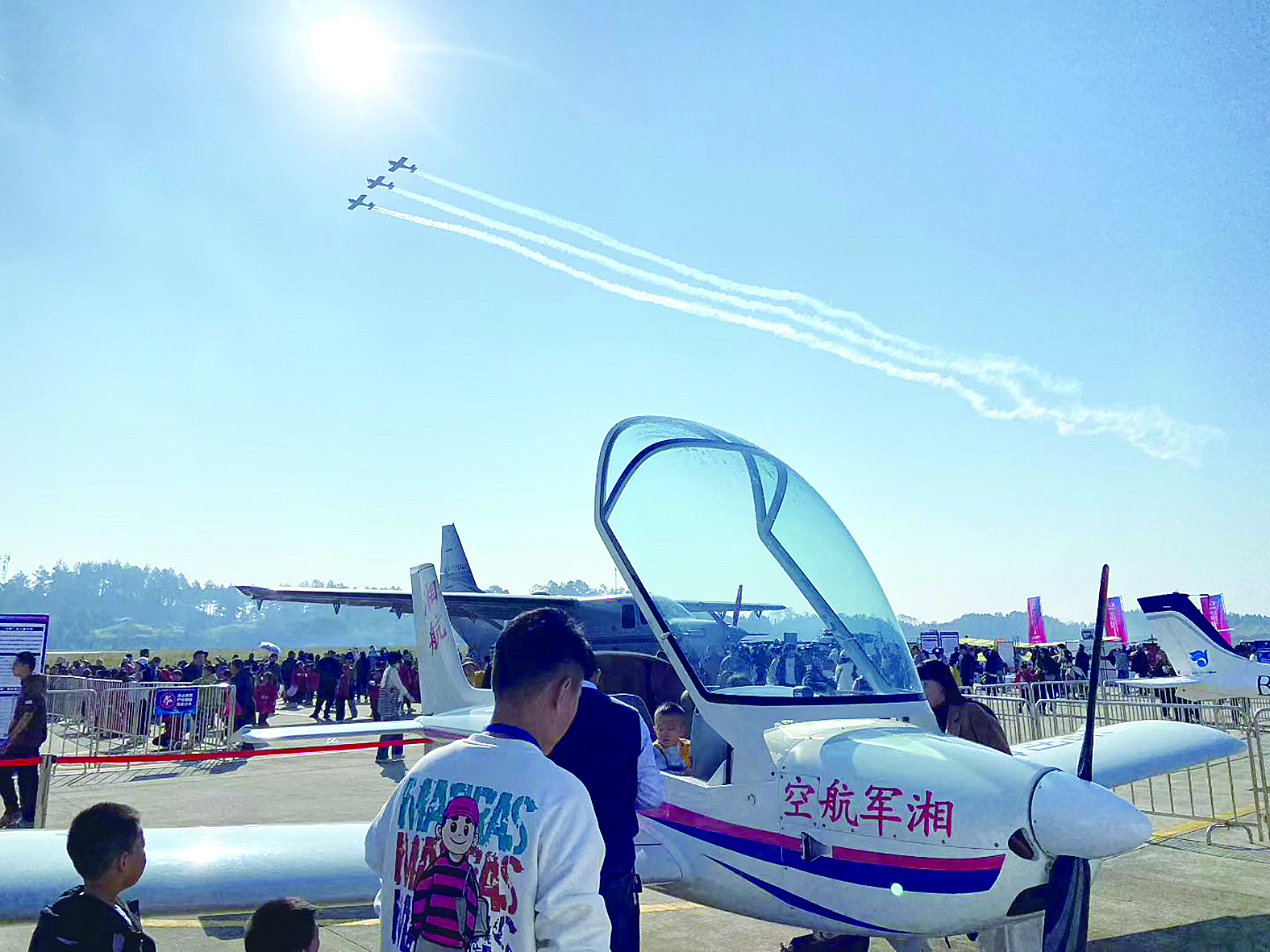 作为每一届动态飞行表演的“重头戏”,特技飞行都是观展市民最为期待和关注的。记者现场看到,尽管未到正式表演时间,但在观展区域已经人潮涌动,市民纷纷找寻最佳观看位置,其中有的人甚至席地而坐,翘首以盼飞机的英姿。