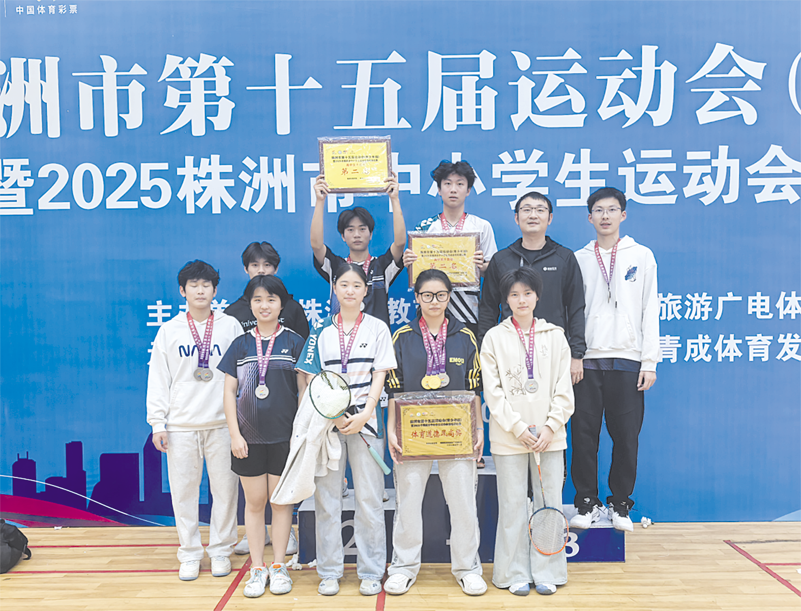 株洲新闻网讯(通讯员/武志军) 近日,2025年株洲市第十五届运动会羽毛球比赛收官,株洲市第四中学羽毛球队在全市28支参赛队伍中脱颖而出,斩获2金4银。