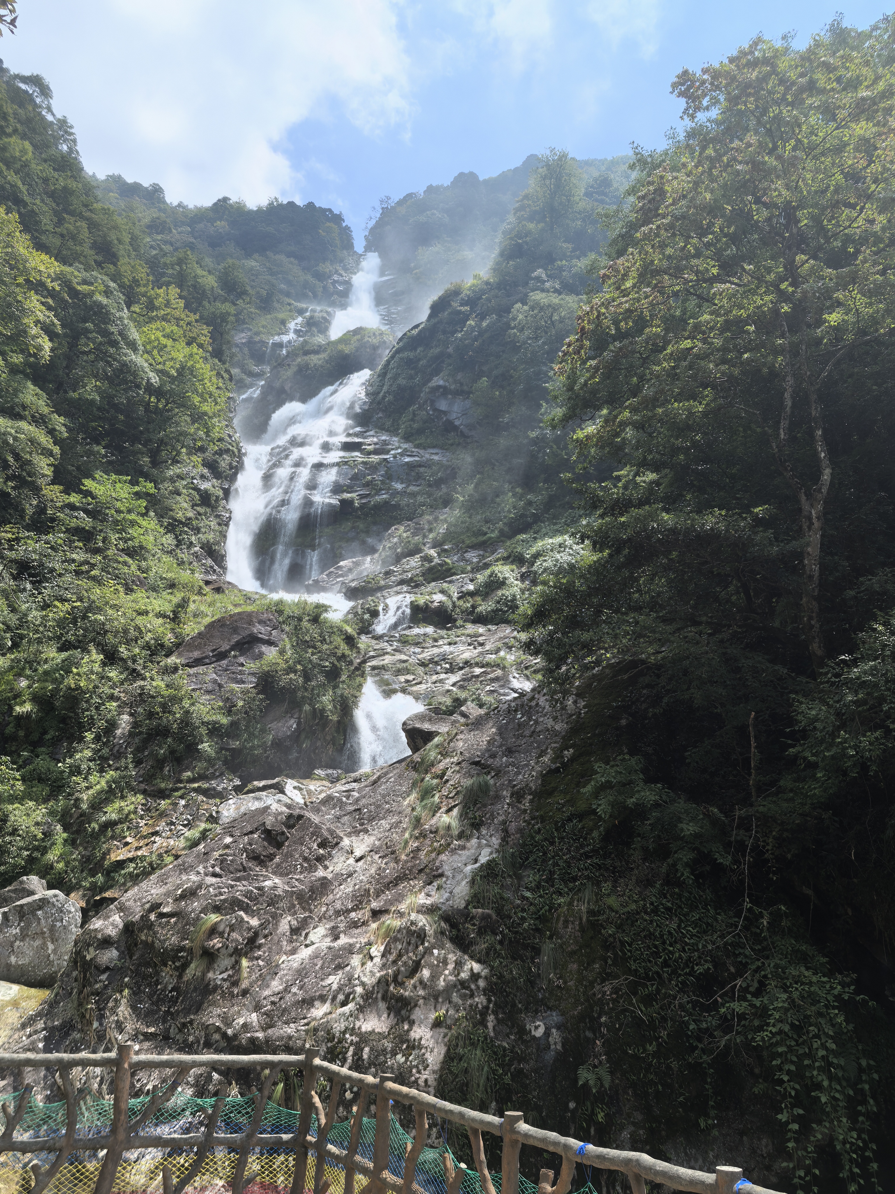 云上大院景区地势陡峭,形成了许多跌水、瀑布,其中以东坑飞瀑(又名神农飞瀑)最为著名。瀑布高235.2米,堪称“湖南第一高瀑布”。瀑水分为三叠,直泻而下,贯穿于蓝天、绿树、峭崖之间,气势磅礴,颇有“黄河之水天上来”之势。此瀑不仅高,水量也大,一级撞击一级,声如奔雷,震耳欲聋,可惜养在深山,游人稀少。