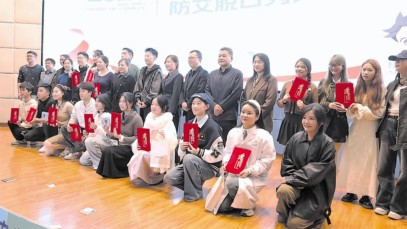 11月30日,湖南工业大学报告厅,株洲市“健康杯”防艾脱口秀大赛决赛举行。图为获奖选手与与会领导嘉宾合影。受访单位 供图