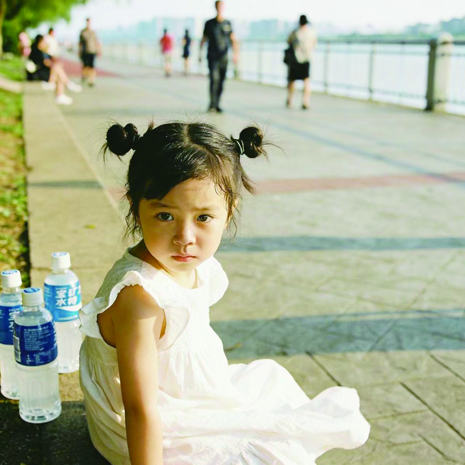 来沿江风光带散步的人不少,我一边跑着,一边回避着行人。忽然,一个小孩从夜色中窜了出来,吓了我一大跳。我迅速减慢速度绕开,回头看了她一眼。这是一个约莫八九岁的小女孩,头上扎着一对羊角辫,身上穿着一条白色的连衣裙,见我放慢脚步回了头,一声清脆甜嫩的声音响起:“伯伯,买矿泉水吗?”小女孩两手各拿着一瓶矿泉水。