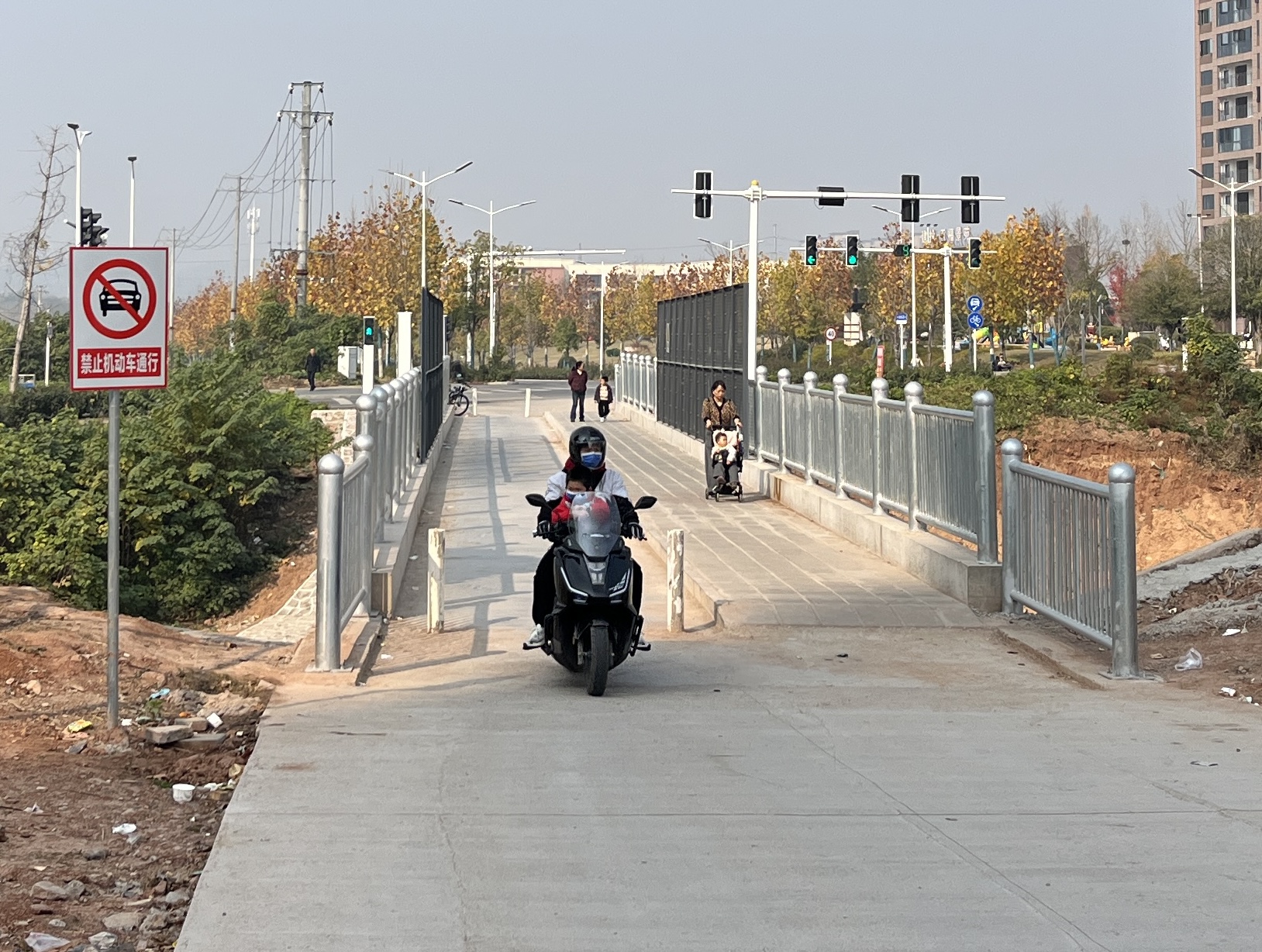 12月9日,记者得知迎风路跨铁路桥已开放通行。桥头处的防护栏杆和中部的安全防抛网安装到位,该桥设有人行道、非机动车道,禁止机动车通行。该桥将分别位于两个桥头旁的美的城体育公园和迎风北路街头公园连接了起来,为市民休闲带来新体验。