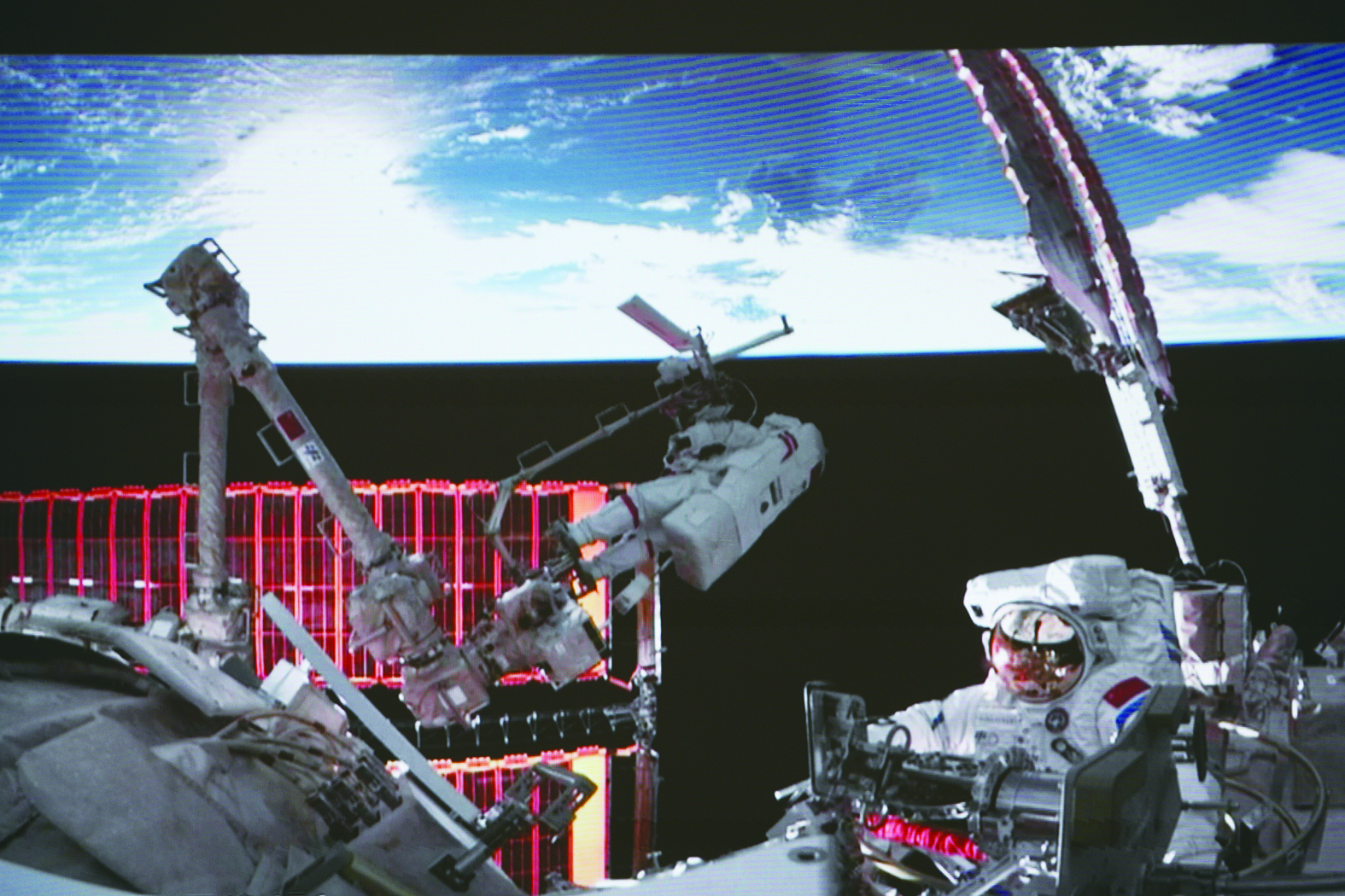 这是12月9日在北京航天飞行控制中心屏幕上拍摄的神舟二十一号乘组航天员张陆与武飞(右)在舱外工作的画面。新华社记者 刘艺 摄