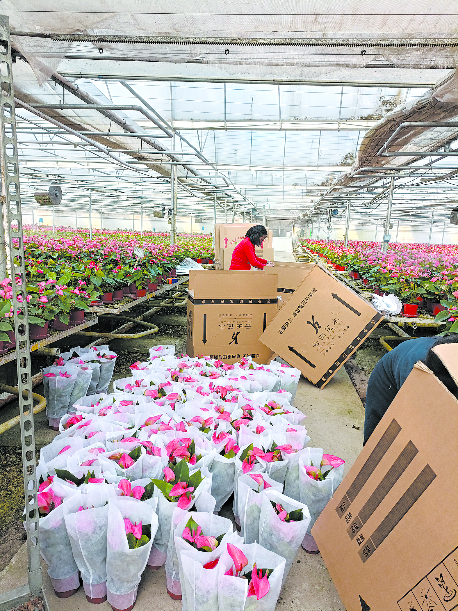◀云田花卉生产基地大棚内,工人正忙着将红掌、绿植等鲜花成品打包发运。 记者/李逸峰 摄