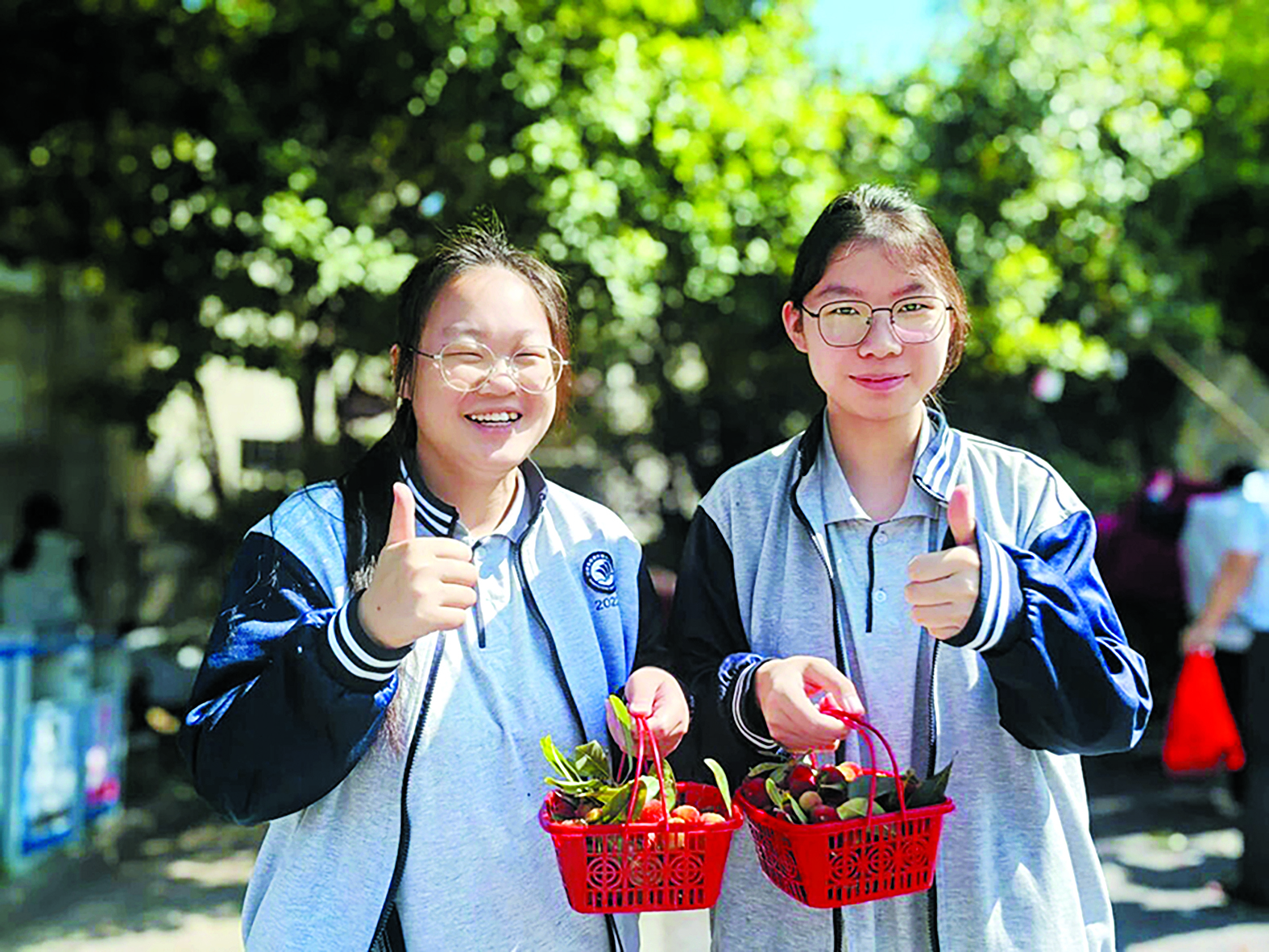 学校组织学生采摘校内的杨梅,放松心情。 记者/戴凛 摄