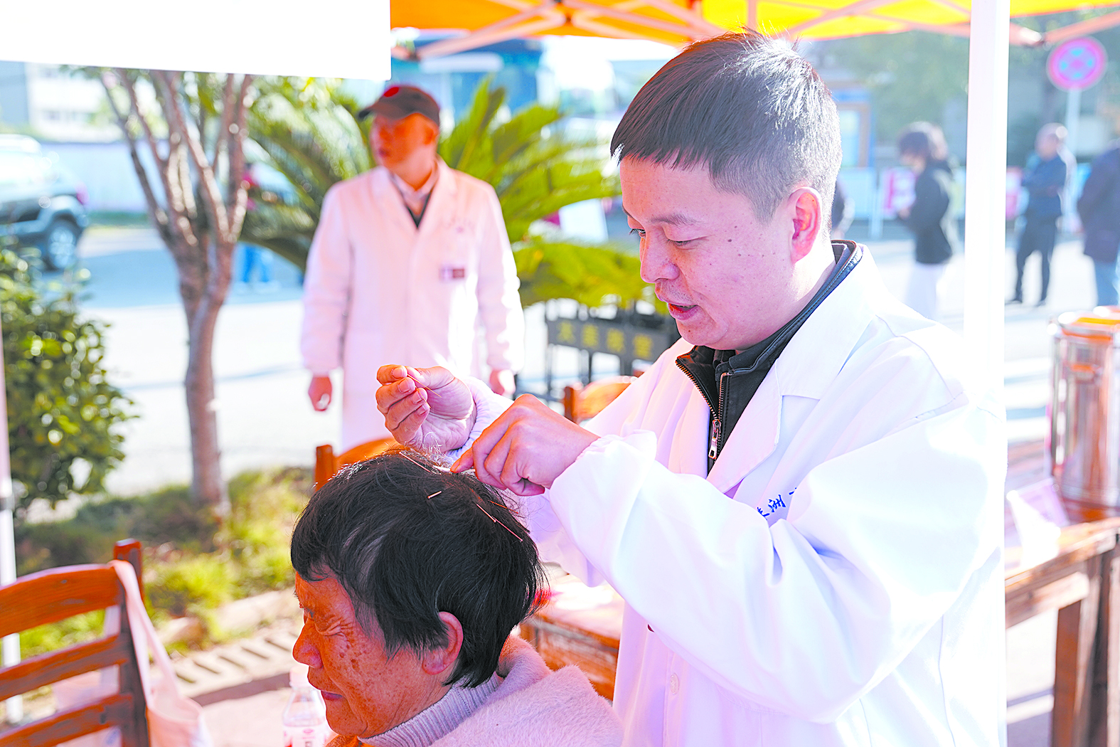 ▲医生在“老年集市”活动中为群众服务
