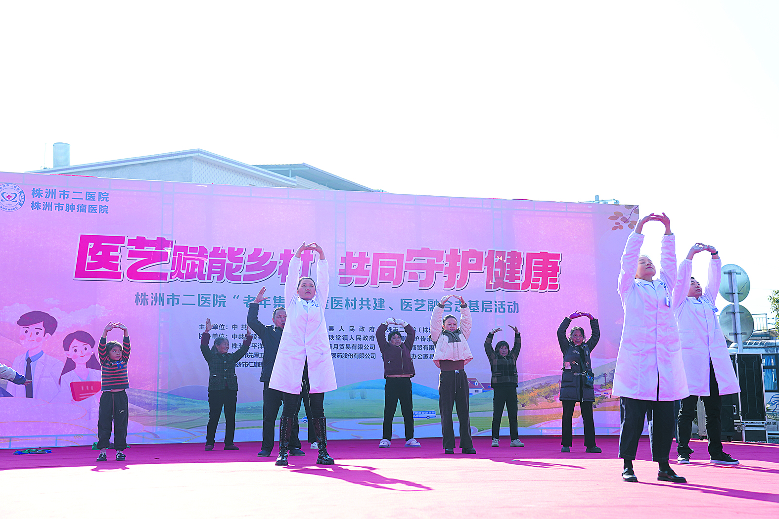 集市开场,文体表演活动率先点燃村民“精神气”。川剧《变脸》的脸谱变幻间,72岁的陈奶奶跟着医护人员带领的健康养生操舒展筋骨,她额头渗出的细密汗珠与嘴角的笑靥相映:“不光身子舒服了,心里也亮堂!”医院党委精心设计的“医艺融合”环节,将传统戏剧、民俗表演与健康科普有机结合,医护人员现场带领居民演示的健康操教学则让“治未病”理念具象化。