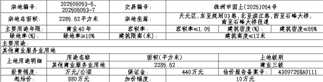 四、本次挂牌出让的详细资料和具体要求,见挂牌出让文件。申请人可于2025年12月19日08时00分至2026年01月07日17时00分到湖南省(株洲市)国有资产资源交易平台(https://szjy.zzzyjy.cn:29091/portal/index)获取挂牌出让文件。