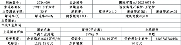 2024-004:(一)本项目实施“标准地”出让,固定资产投入强度≥224万元/亩,地均收入≥280万元/亩,地均税收≥17万元/亩。须按醴陵市自然资源局出具的《醴陵市2022年第十九批次建设用地A地块用地性质认定蓝线图及规划条件》实施。交地之日起3个月内须开工建设,18个月内须完成全部建设并投产。(二)竞得者应在成交确认书签订之日起10个工作日内签订出让合同。(三)土地成交价款由竞得者在出让合同签订之日起180日内全额缴清,逾期未缴部分,根据相关规定,征收违约金。(四)由湖南醴陵经济开发区管委会负责交地,并承担因交地产生的相关法律责任。