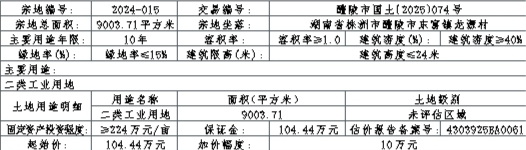 四、本次挂牌出让的详细资料和具体要求,见挂牌出让文件。申请人可于2025年12月25日08时00分至2026年01月13日17时00分到湖南省(株洲市)国有资产资源交易平台(https://szjy.zzzyjy.cn:29091/portal/index)获取挂牌出让文件。
