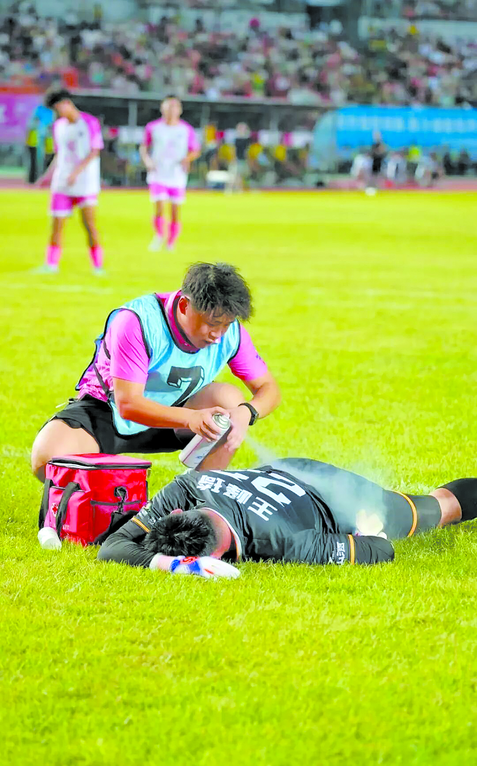 图为该校康复师在比赛现场为受伤队员进行治疗。通讯员 供图