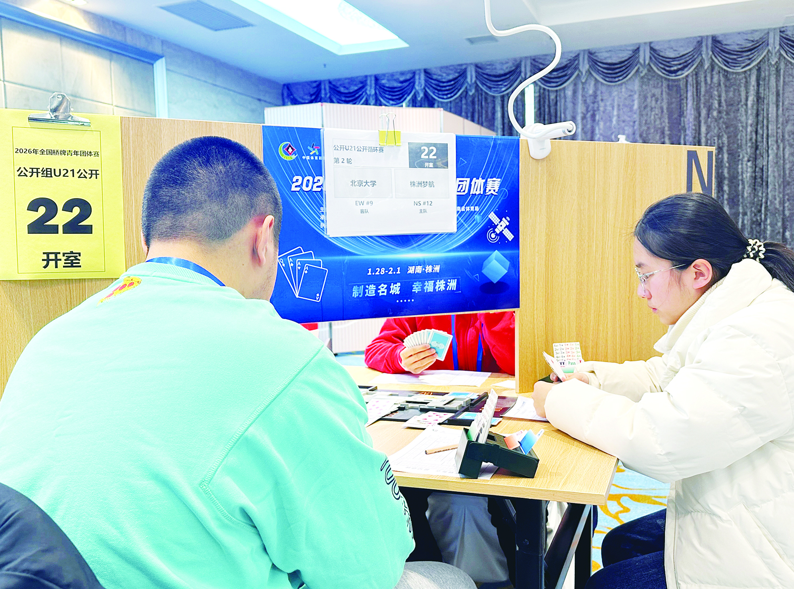 1月28日,2026年全国桥牌青年团体赛在我市拉开帷幕,来自全国各地的75支队伍参赛,规模为历年最大,这也是该项赛事首次在株洲举行。比赛将持续至2月1日。图为北京大学与株洲梦航对战。 株洲日报全媒体记者/戴凛 摄