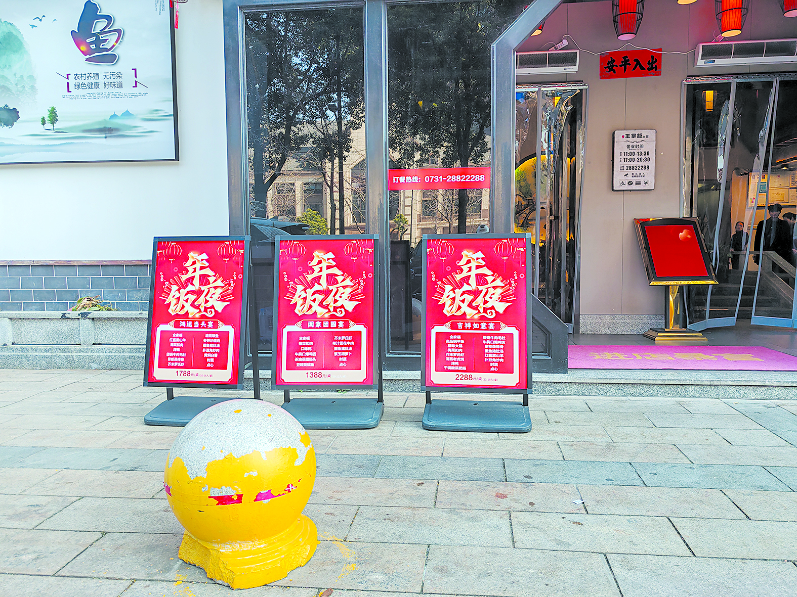 ▲天元区一饭店将年夜饭预订展板放在门口显眼位置。 记者/肖星平 摄