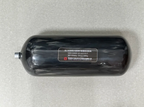 ▲时代新材自主研制的无人机用铝内胆碳纤维缠绕储氢瓶。 通讯员 供图