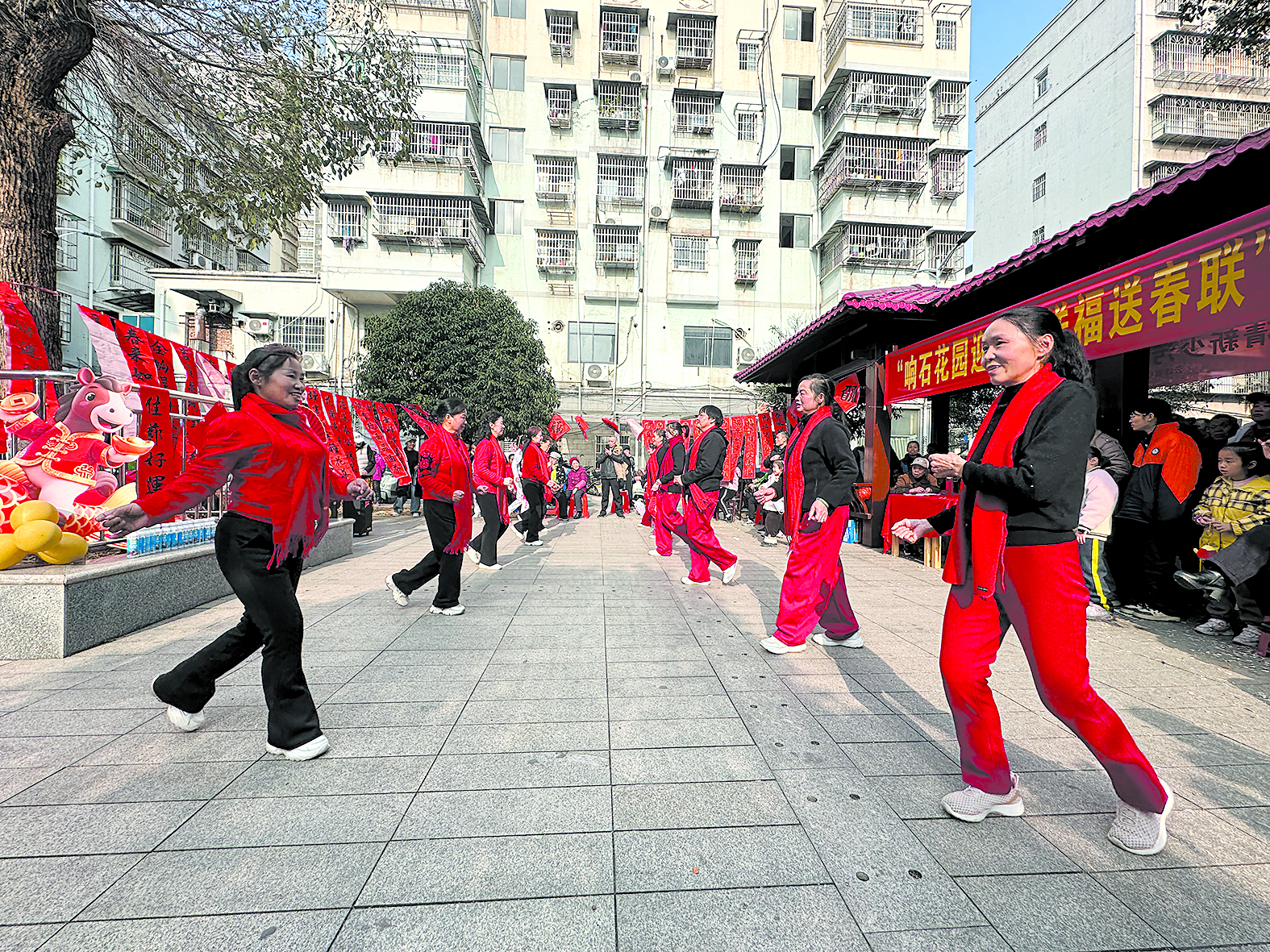 1月28日,石峰区响石岭街道云峰阁社区响石花园小区里锣鼓喧天,一场由居民自导自演的迎新春活动热闹开场,吸引了众多居民邻里参与。没有专业团队,没有高昂预算,这场活动从策划到演出全部由小区党支部、业委会牵头,楼栋长、网格员和文娱爱好者共同完成。志愿者和网格员热情递上由小区居民林老师亲手书写的春联,“舞台”上,文娱队成员们踏着欢快节拍起舞,引得现场掌声阵阵。党员、业委会成员、物业工作人员与居民围坐一圈,桌上茶果飘香,话里家常流淌。大家不仅分享过去一年的生活点滴,更围绕物业服务、环境改善等议题踊跃建言。