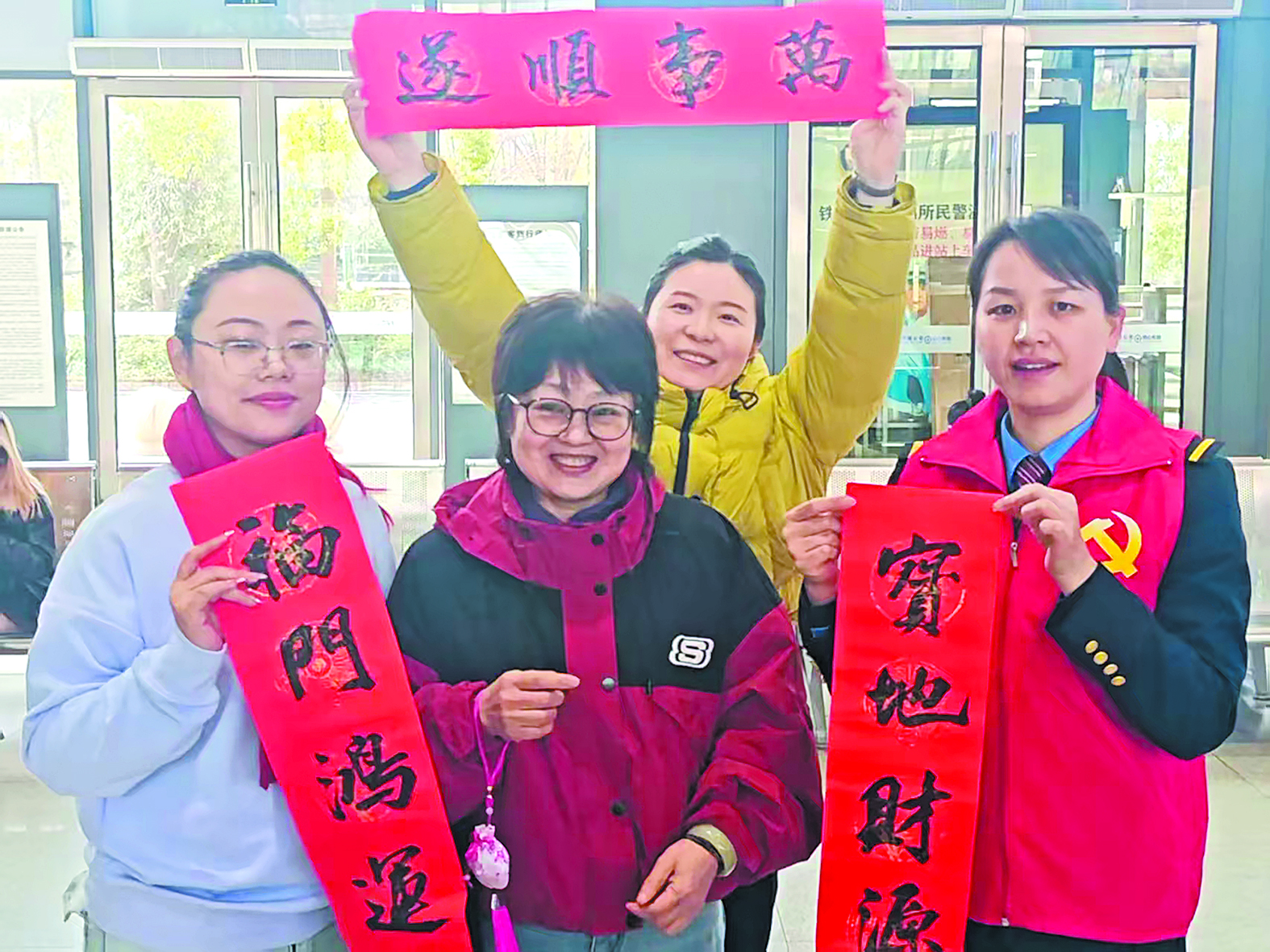 2月2日,2026年春运首日,田心东站候车室内暖意融融,一场集文艺表演、健康服务、民俗送福于一体的暖心活动精彩开启。悠扬歌声、活力舞蹈、趣味八段锦、以及手工香囊制作、免费健康检测、春联福字派送等活动轮番上阵,为踏上归程的旅客送上满满年味与贴心关怀。图为车站工作人员为旅客送“福”送春联。