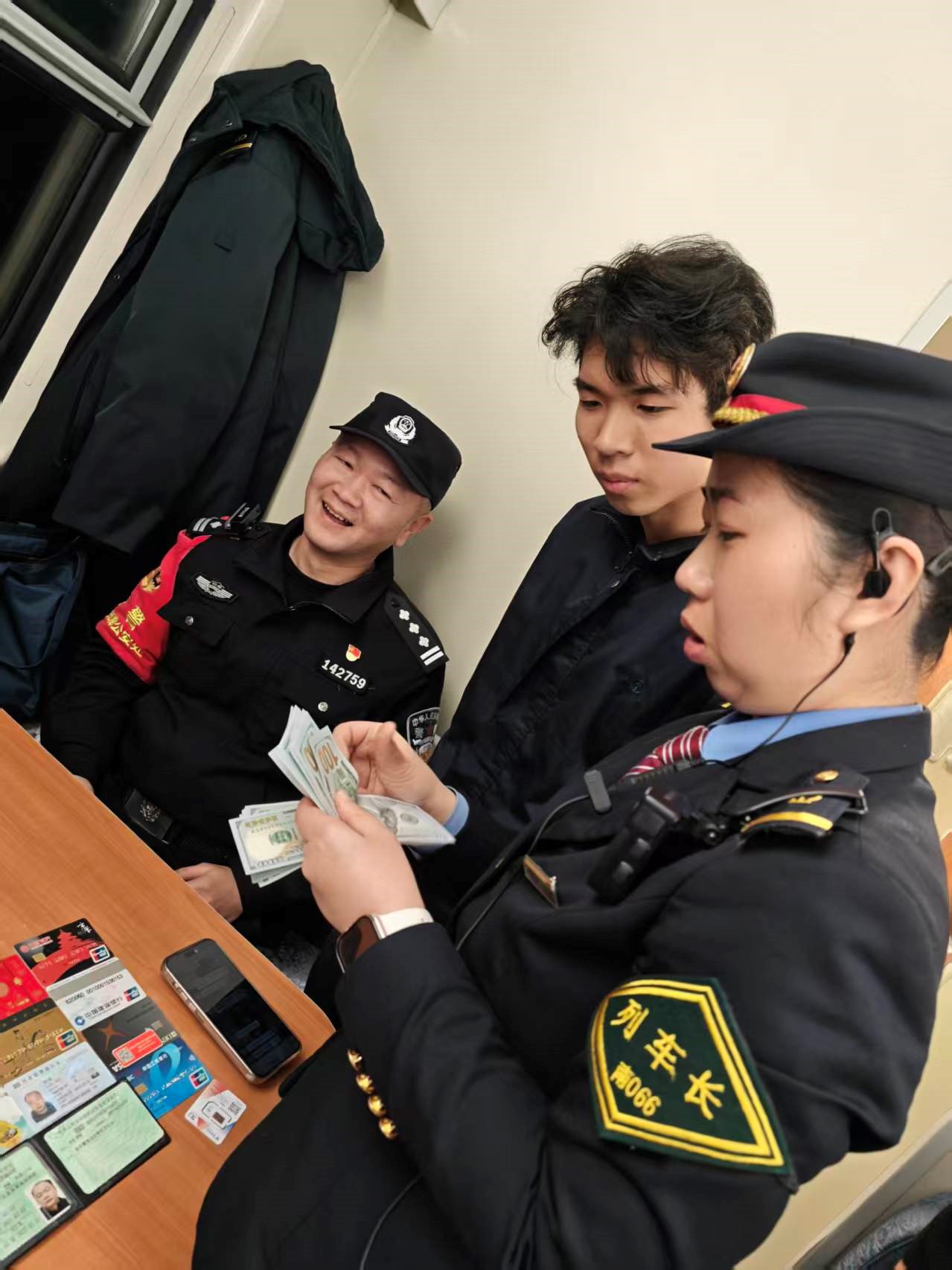 万朕宇按照培训流程,迅速上报列车长、乘警长等相关人员,对钱包进行登记、封存、保管,全程留痕。列车广播寻失主后,一名中年男子匆忙赶来认领。证件核对无误、再次清点分毫不差后,男子激动致谢,称钱包里是一家人的旅游费用。