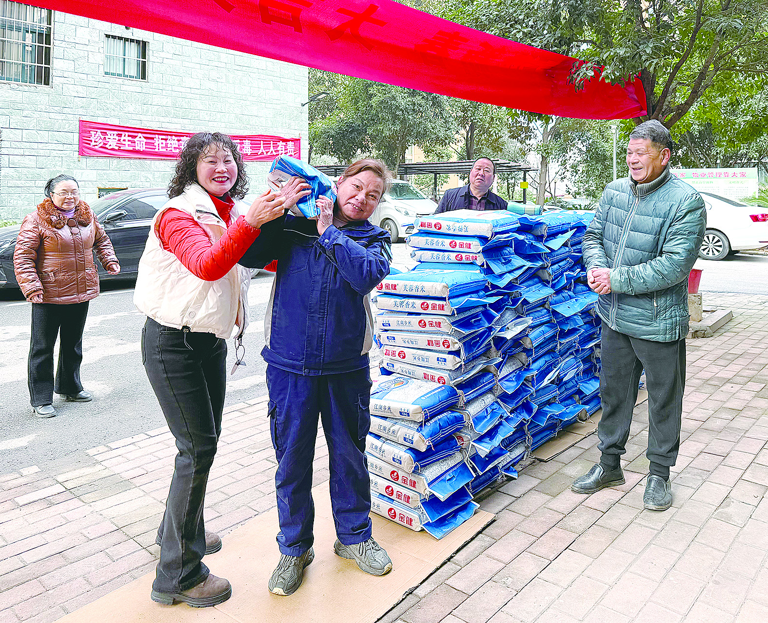 2月8日,荷塘区桂花街道西子社区东方铭苑小区,物管会将小区2025年公共收益结余资金1万余元用于购买大米,对小区业主进行发放。