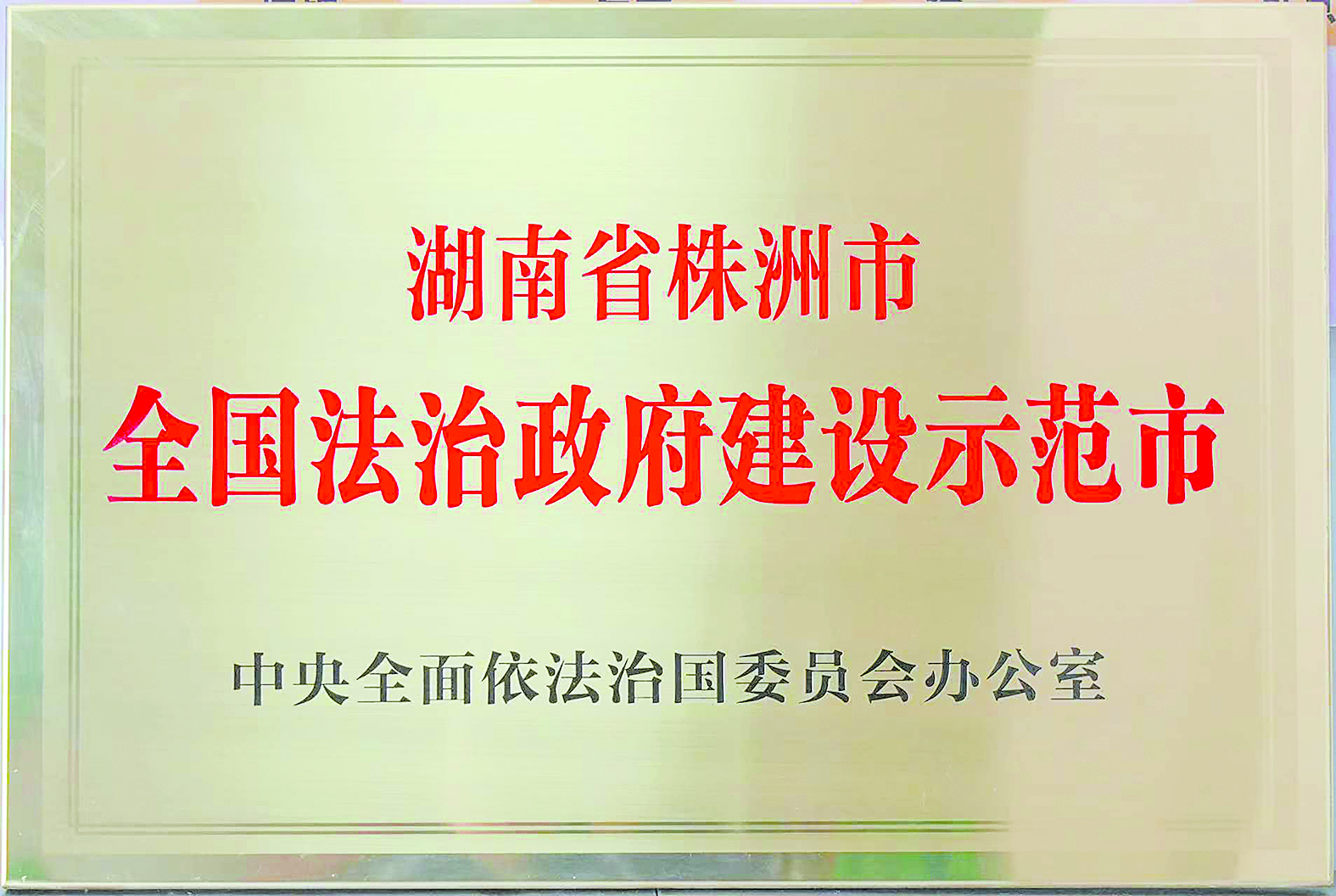 ▲湖南省株洲市全国法治政府建设示范市牌匾。 受访单位 供图