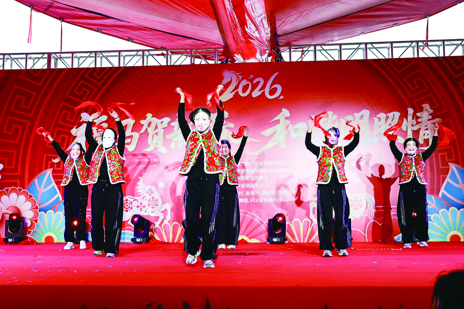 鼓点落,雄狮起。明照村舞狮队四名队员灵动腾挪,一招一式尽显传统民俗的力道与精气神,瞬间将年味“拉满”。紧接着,港风舞蹈串烧、古筝独奏、花鼓戏、大合唱等十五个节目轮番登场——既有乡土根脉,也有潮流节拍,台上台下,尽是明照人的风采。