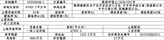 202508044-1:一、【《工业用地项目供后监管协议》签订】最高报价人须与株洲高新技术产业开发区田心片区管理办公室签订《入园协议》以及《工业用地项目供后监管协议》方可签订宗地《成交确认书》,否则竞买无效,保证金不计息退还,由此造成的一切经济、法律责任由最高报价人承担。二、【“标准地”指标】产业类别:轨道交通产业(未经批准不得改变产业分类);固定资产投入强度:不低于270万元/亩;地均税收:不低于17万元/亩;地均收入:不低于400万元/亩;容积率:1.0-2.0;科研经费投资强度:/。三、【逾期缴纳土地出让金处置】竞得人不按土地出让合同约定及时缴纳土地出让价款的,报经市人民政府批准,出让人有权根据《国有建设用地使用权出让合同》第三十条的约定,扣除定金(按宗地出让价款的 20%确定) 后直接解除土地出让合同,收回土地使用权。