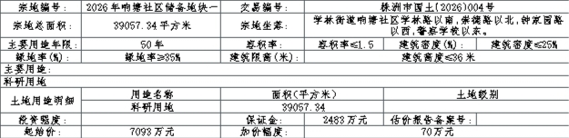 四、本次挂牌出让的详细资料和具体要求,见挂牌出让文件。申请人可于2026年02月14日08时00分至2026年03月05日17时00分到湖南省(株洲市)国有资产资源交易平台(https://szjy.zzzyjy.cn:29091/portal/index)获取挂牌出让文件。