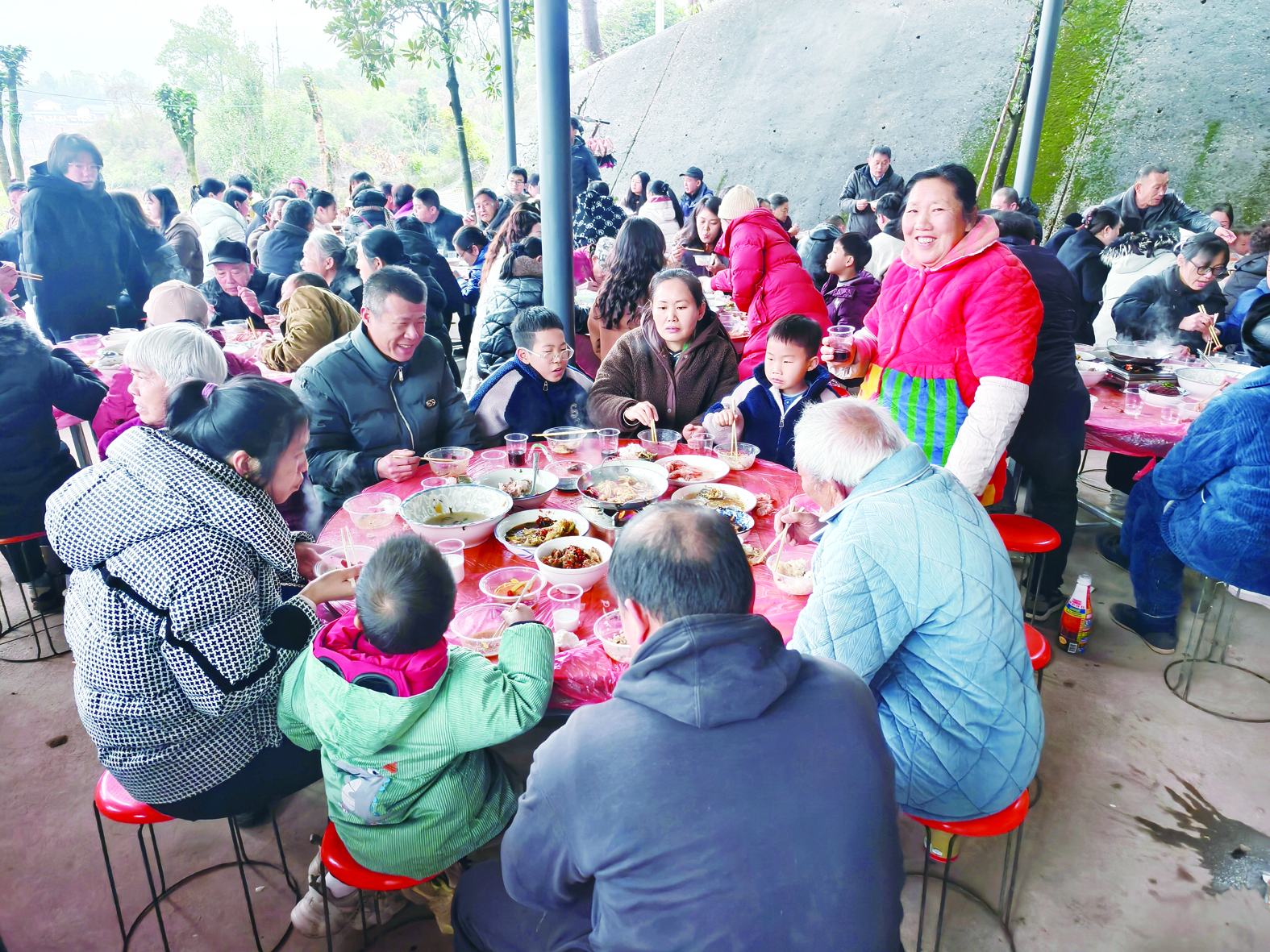 当天下午1时许,村民陆续冒雨赶来帮忙做准备工作,摘菜、洗菜、切菜、摆碗筷,各项工序紧张有序进行。尽管天气寒冷,但每个人的脸上都洋溢着期待的笑容。下午4时许,随着茅太新村党总支书记张章一声“开席喽”的吆喝,热气腾腾的菜肴接连上桌:象征着团圆的全家福、寓意年年有余的红烧鱼、本地特色的酸辣椒蒸鸡……20桌酒席,12道菜摆得满满当当,色香味俱全。