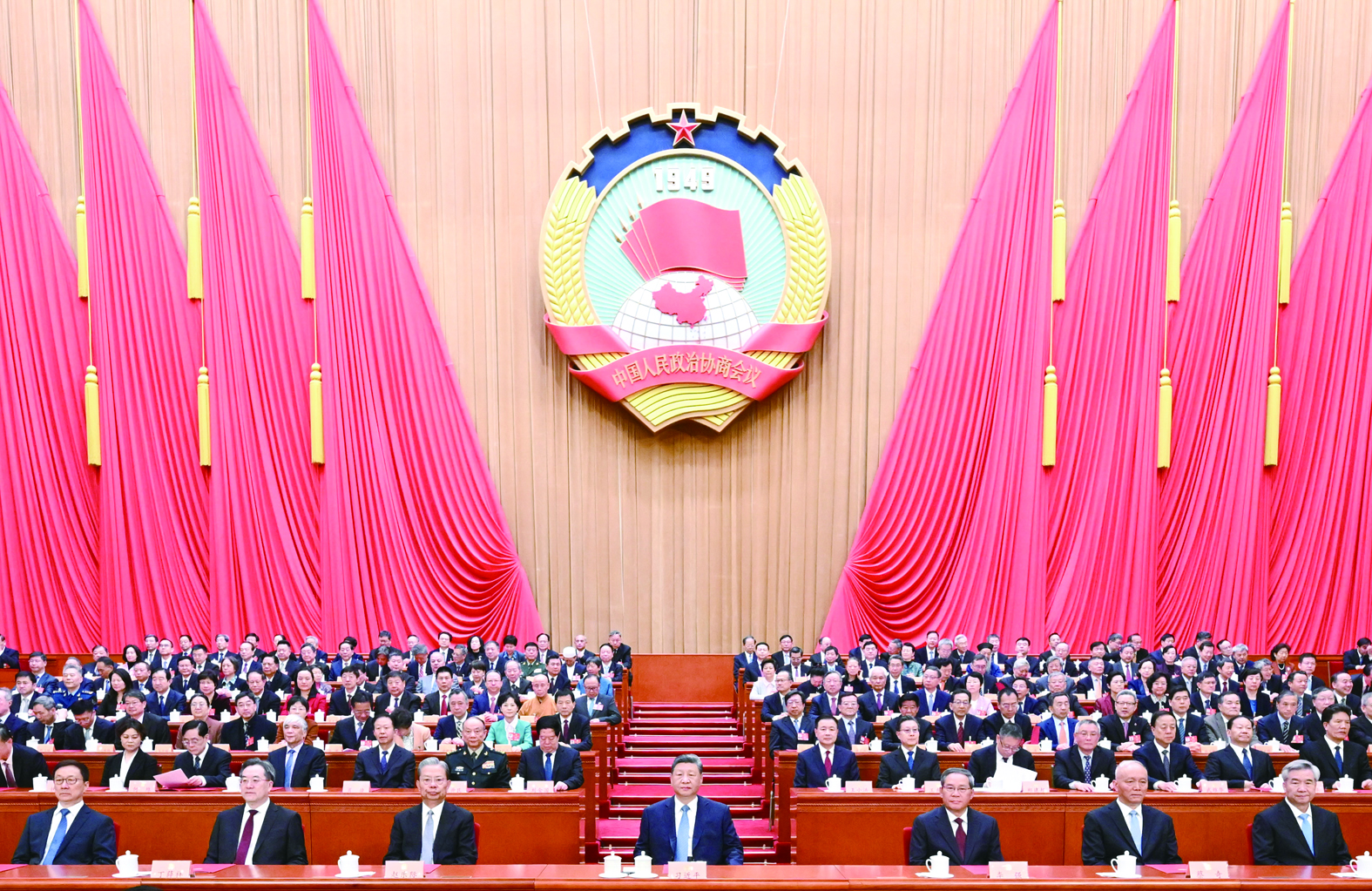 3月11日上午,中国人民政治协商会议第十四届全国委员会第四次会议在北京人民大会堂闭幕。这是习近平、李强、赵乐际、蔡奇、丁薛祥、李希、韩正在主席台就座。新华社记者/燕雁 摄