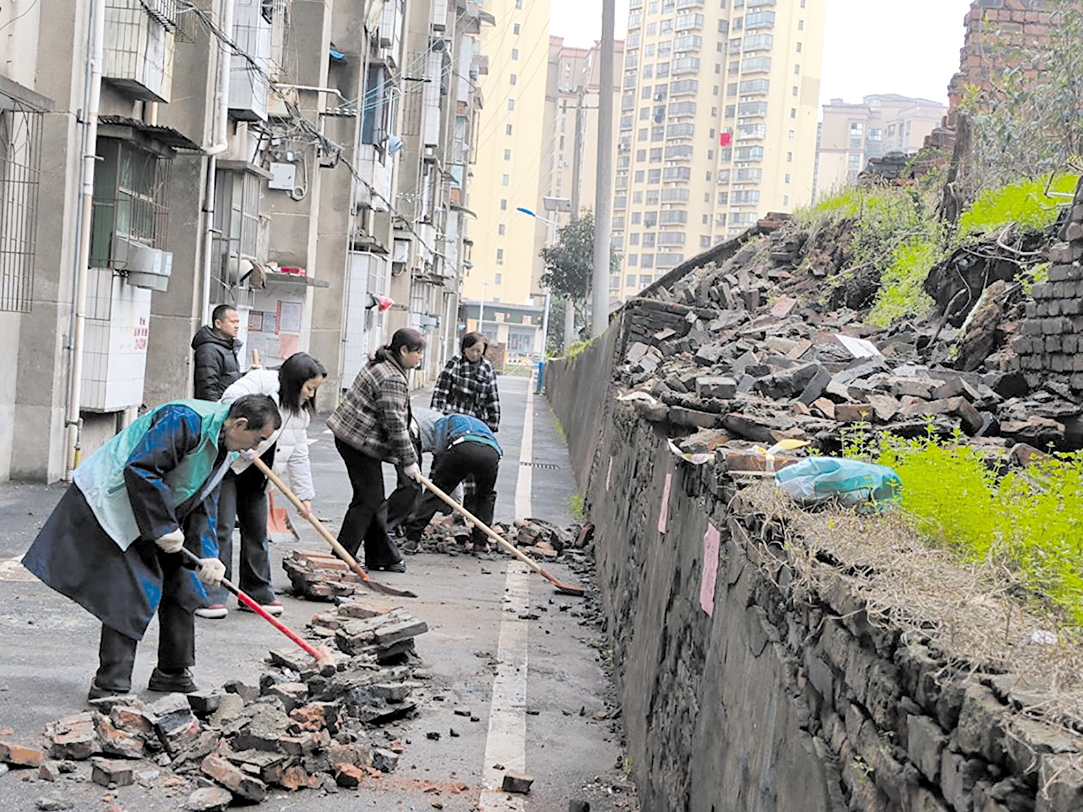 3月5日,志愿者和社区工作人员清理围墙倒塌后产生的砖块、碎石。受访者 供图