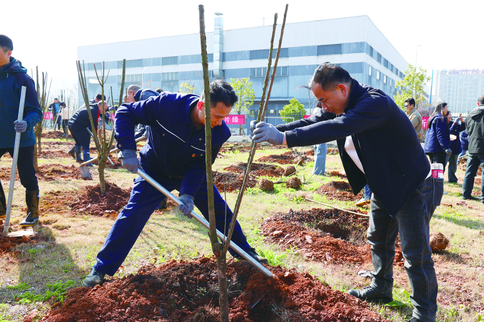 植树现场,大家挥锹挖坑、扶苗培土,每一道工序都认真细致、规范到位,现场气氛融洽和谐。当天,共种下600余棵树苗。