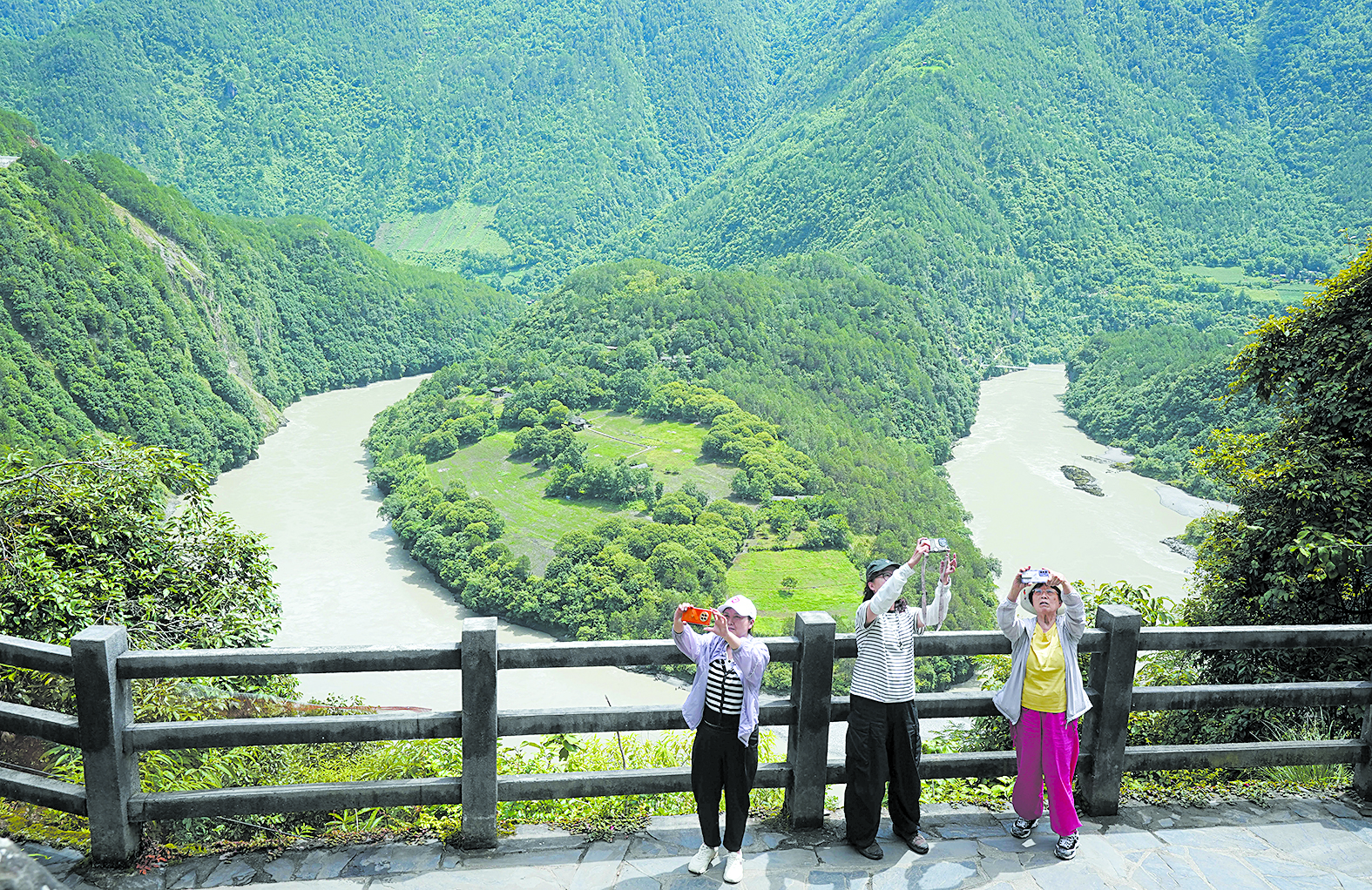 游客在云南省怒江傈僳族自治州贡山独龙族怒族自治县怒江第一湾拍照游玩(2025年7月15日摄)。 新华社发 梁志强 摄